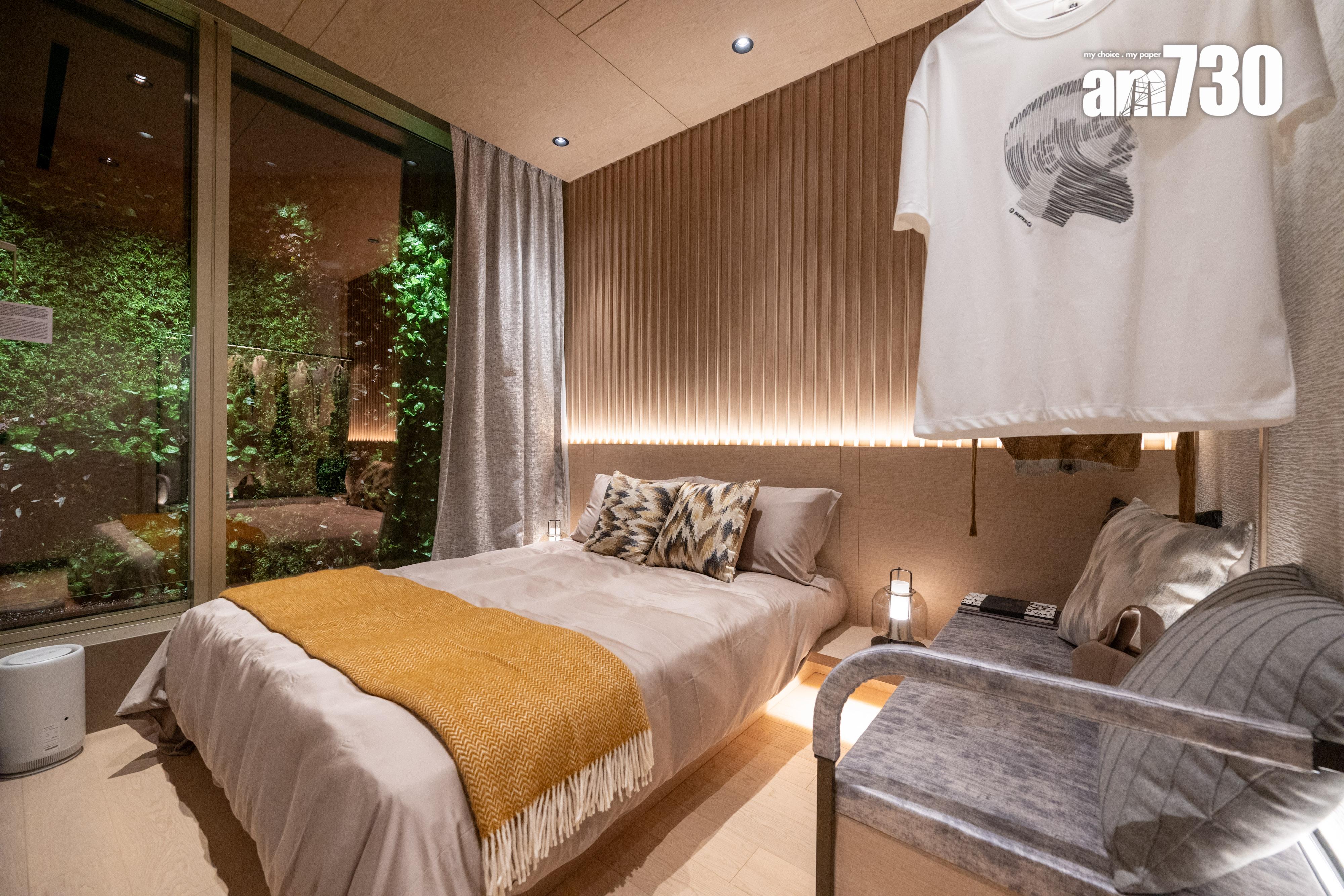設計師在規劃睡房1時按照建築師的設計原意,將帶窗戶的儲物室打造成收藏室,房間設有落地大玻璃窗;另特別選用榻榻米鋪砌地板,牆邊實木層架放置充滿禪意美學和東方元素的家具及生活擺設。窗前擺放同色系實木和室椅桌,可供住戶靜靜地呷一口茗茶,猶如置身於日式美學的自然環境之中。主人睡房空間方正寬敞,落地玻璃窗將自然光線與四周綠意引入室內。胡桃木條牆身營造溫馨舒適的臥室環境,雙人大床的另一側擺放一體式梳化連開放式高身衣櫃。