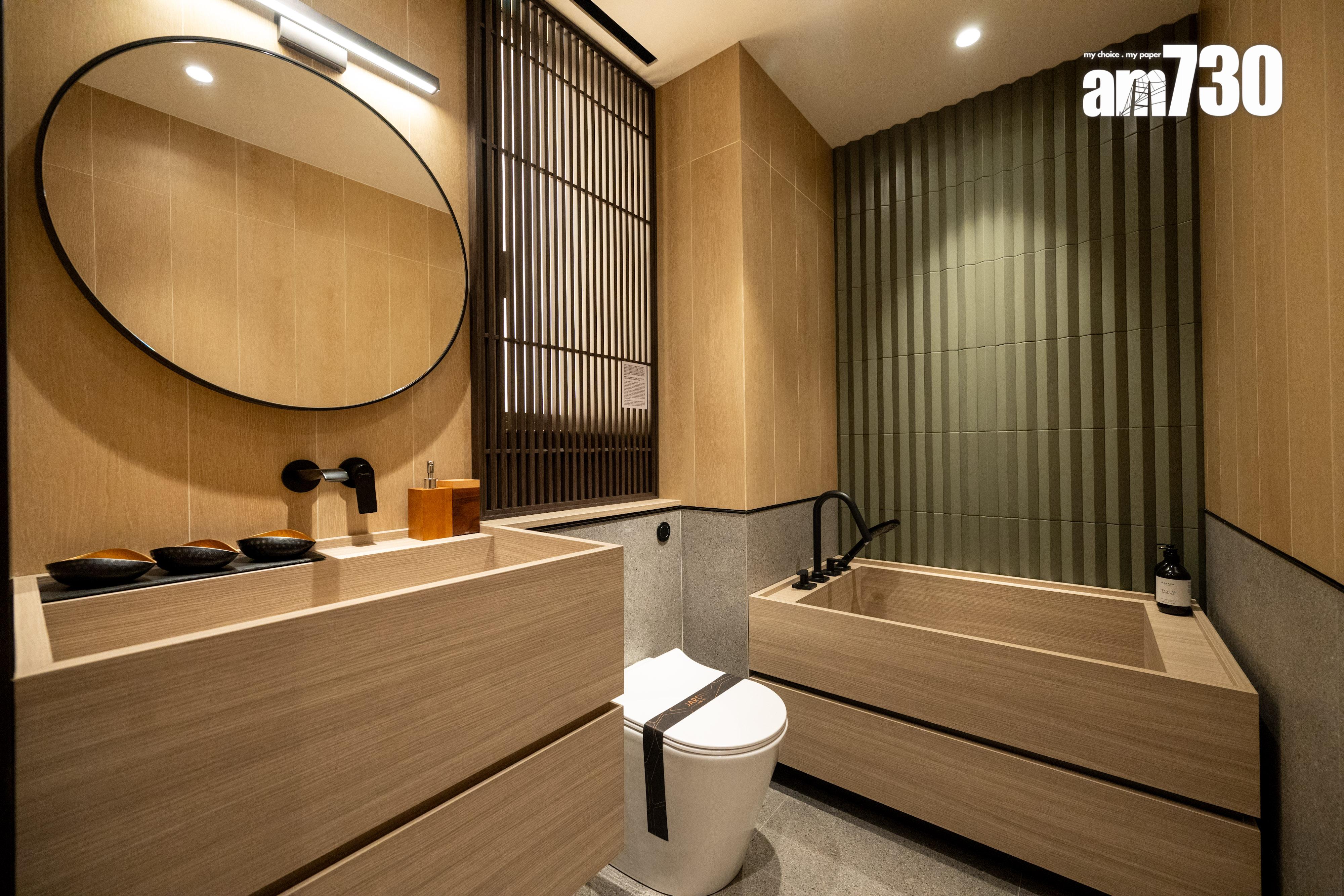 浴室貫徹全屋日式設計,設計靈感取自日式風呂文化,以淺木色調營造出寧靜和放鬆的氛圍。設計師仿照日本溫泉的設計風格,安裝一個傳統的日式淋浴和浴缸結合的和式浴缸,可供住戶坐著入浴。洗手盆檯面連儲物櫃同樣選用和式浴缸的物料打造而成,配以大圓鏡,為浴室增添獨特的日式韻味。