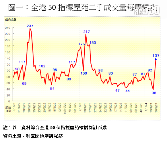 全港50個指標屋苑於上周(2月26日至3月3日)共錄137宗買賣個案,較前周(2月19日至2月25日)82宗大增67%,創自去年3月初以來的52周、即約一年來新高。