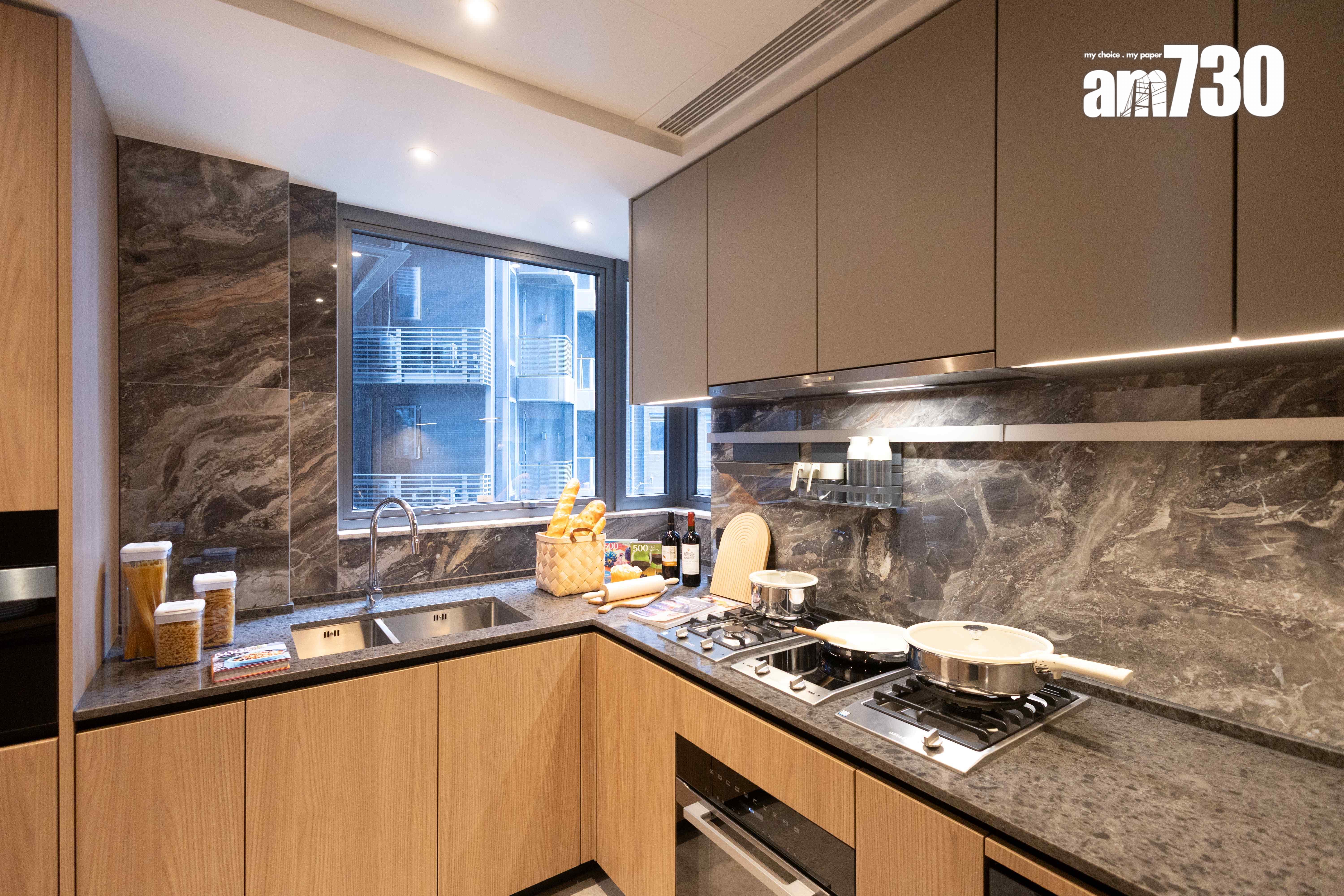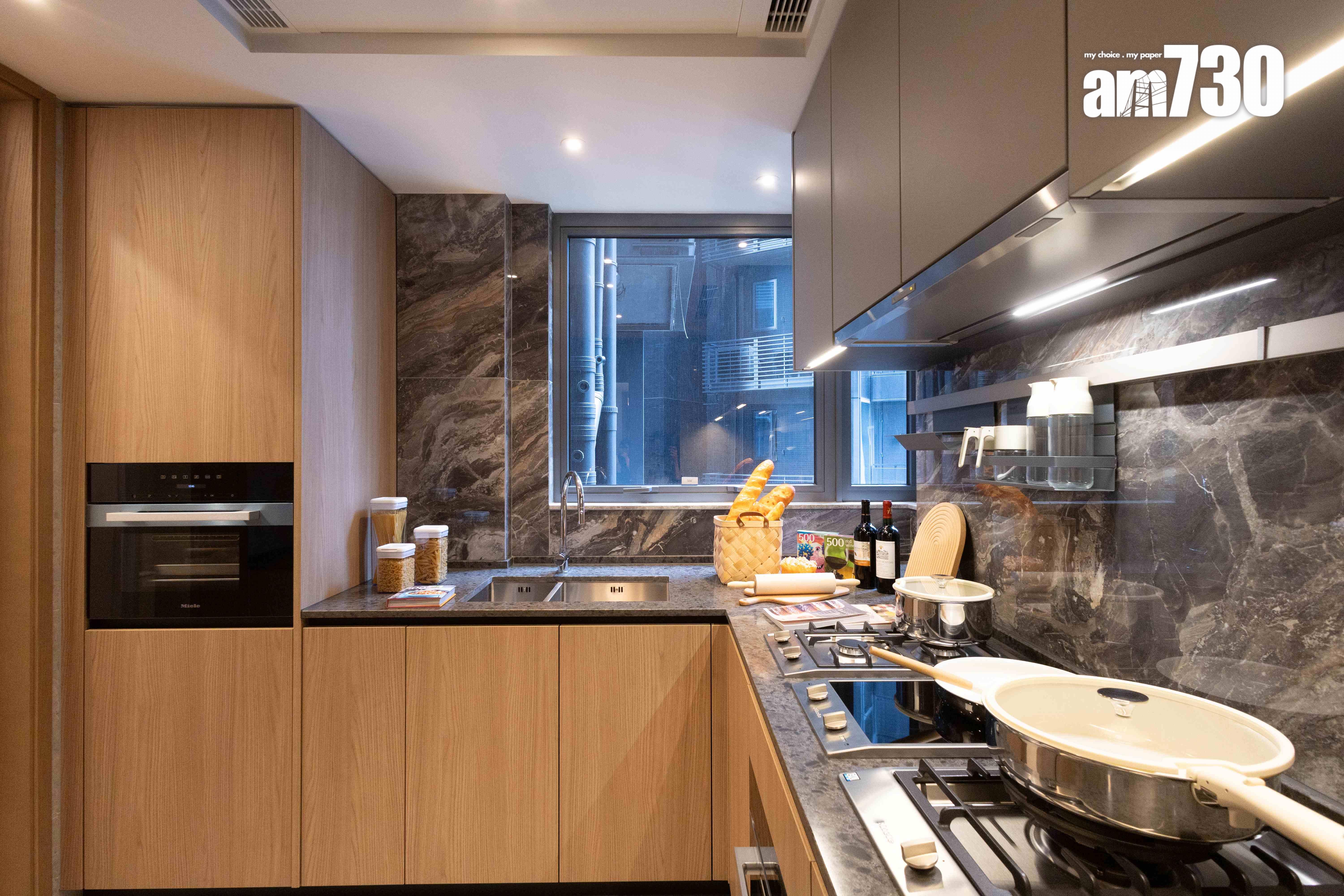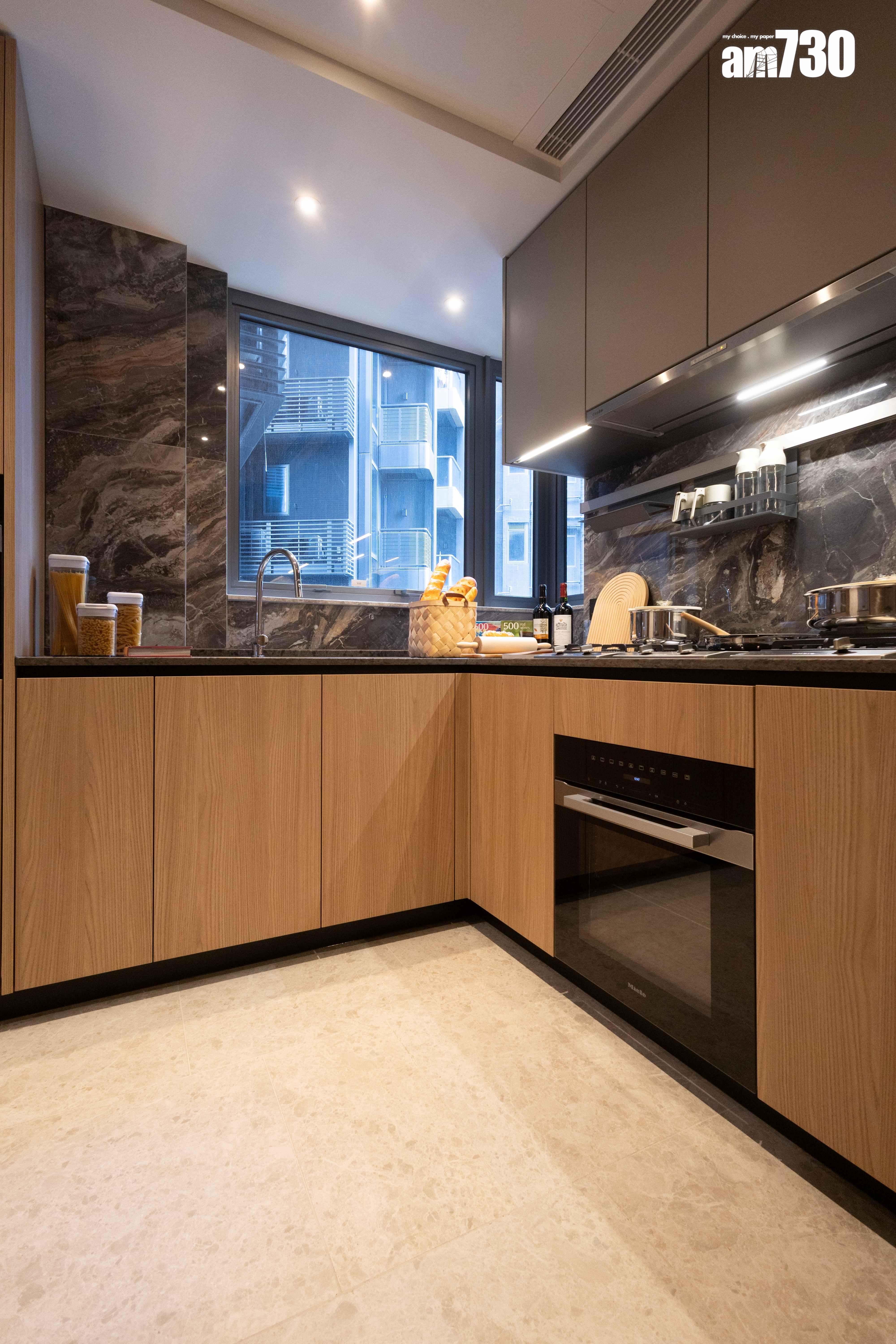 廚房屬梗廚設計,設有L形工作檯面,並連接儲物室及洗手間,讓住戶可增添儲物位置,空間使用上更靈活;廚房工作檯面採用亮麗人造石材,牆身採用仿雲石紋理瓷磚鋪面,美觀耐用;廚櫃為意大利著名品牌Poliform,設有感應燈,方便煮食時隨時開燈,並配備多款 歐洲知名品牌的電器及爐具,包括德國品牌Miele的抽油煙機、蒸爐、焗爐、電磁爐、炒鑊及雙頭氣體煮食爐,以及德國品牌Siemens之嵌入式雪櫃及洗衣乾衣機,更備有法國品牌Vinvautz酒櫃及意大利Gessi水龍頭,讓住戶享受入廚的樂趣;廚房設有獨立冷氣機,讓烹飪空間進一步昇華。