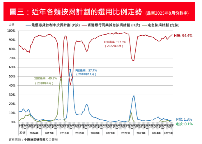 根據金管局2025年8月份統計數字,H按選用比例按月減少1.3個百分點至94.4%,較7月份95.7%(34個月高位)回落,而P按選用比例增加0.1個百分點至1.3%,定息按揭選用比例維持0.1%。王美鳳解釋,8月份HIBOR拆息回升至逾3厘,H按息已升穿封頂息,H按吸引力減少。此外,滙豐銀行上月優化新低息定按計劃,部分買家或在未來轉投定按計劃,繼去年三家大型銀行推出定按後使用率曾由0%升至1.8%,今年初滙豐再推新定按使用率最高達2.1%,預料未來定按使用率將因滙豐新定按計劃而上升。