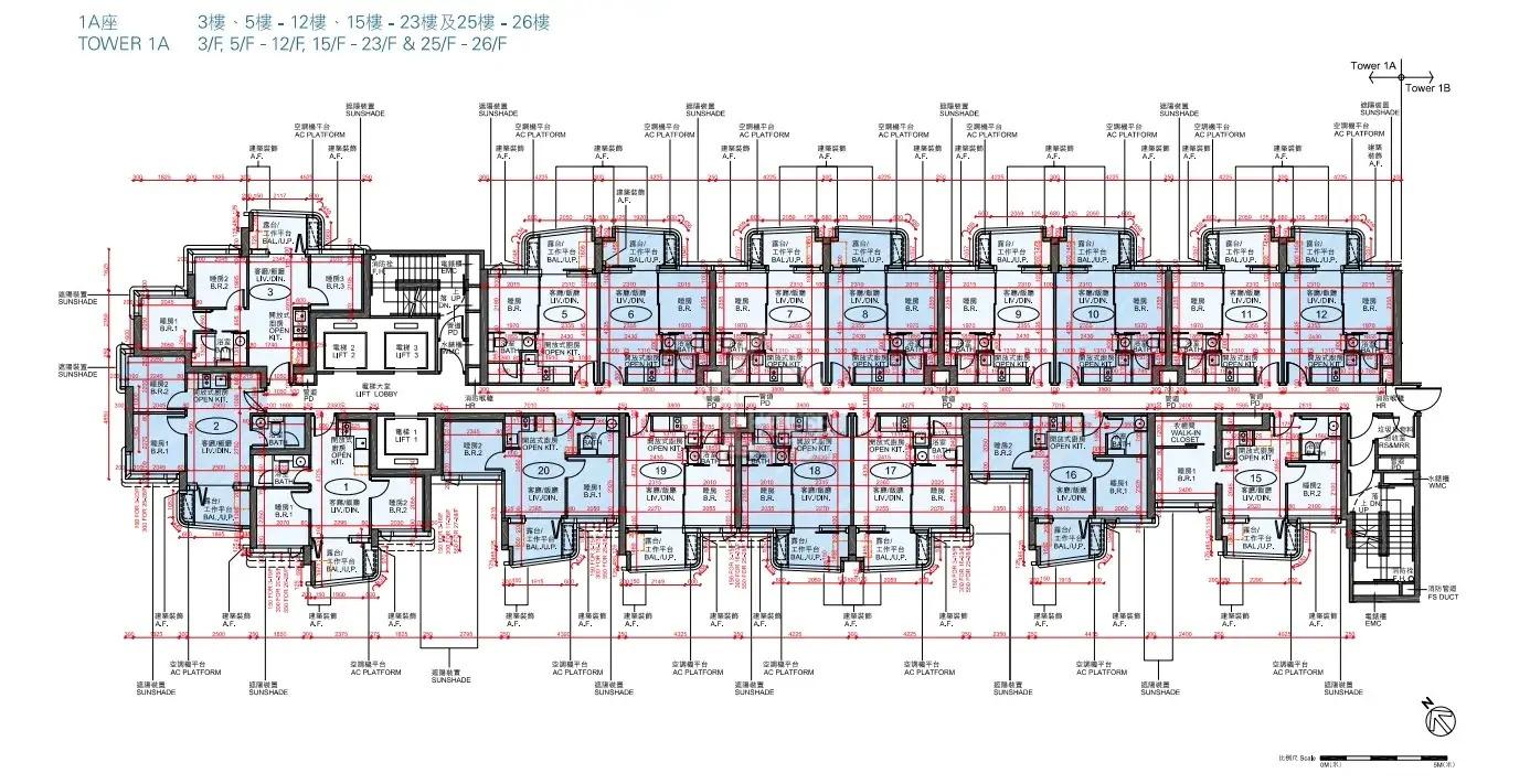 全盤面積最細單位為第1B座2樓16室,開放式間隔,實用面積177方呎,連55方呎平台;面積最大單位為1B座29樓7室,四房間隔,實用面積756方呎,連160方呎平台及630方呎天台,平台外設有樓梯通往私人天台。
