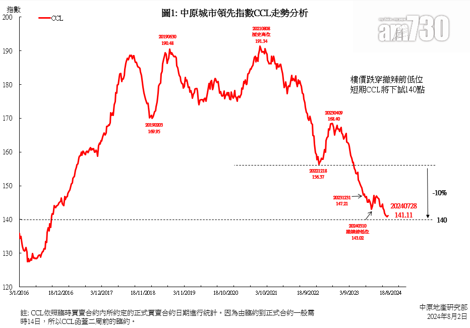 本周CCL仍處於近8年低位,重返2016年10月初時水平,2024年累跌4.14%。指數較2021年8月191.34點歷史高位跌26.25%,較2024年3月撤辣前的低位143.02點跌1.34%。8月1日美國聯儲局及本港大型銀行宣佈維持利率不變,及8月4日屯門黃金海灣第1期意嵐第3輪推售139伙,對本地二手樓價的影響將於8月下旬公布的CCL才開始反映。