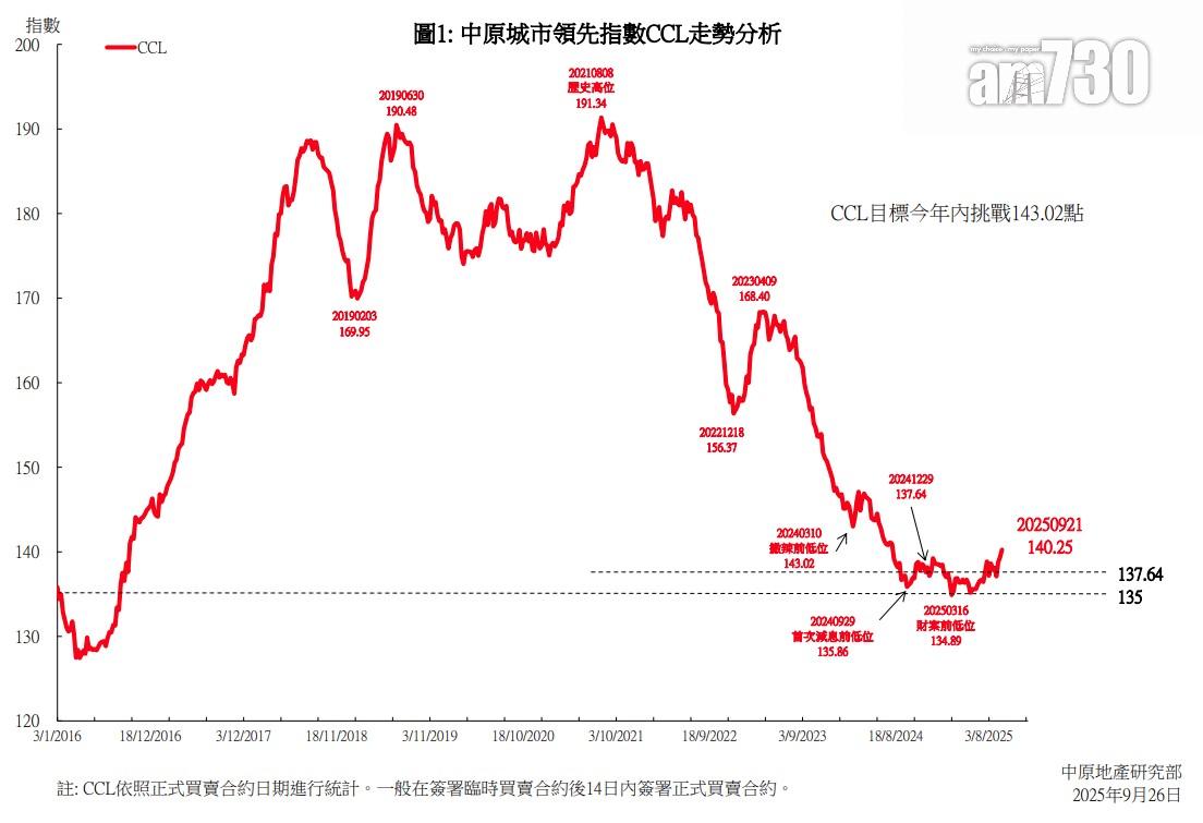 二手樓價升勢持續,中原城市領先指數CCL最新報140.25點,按周上揚0.62%。中原地產研究部高級聯席董事楊明儀表示,CCL連升3周共2.3%,進一步向上升穿140點水平,指數創2024年8月初後的59周新高。落實減息後,買家入市信心轉強,有助釋放更多二手購買力,樓價升勢或可持續。CCL只要再升2.77點或1.98%,便會到達第四季目標143.02點,即2024年撤辣前的低位。