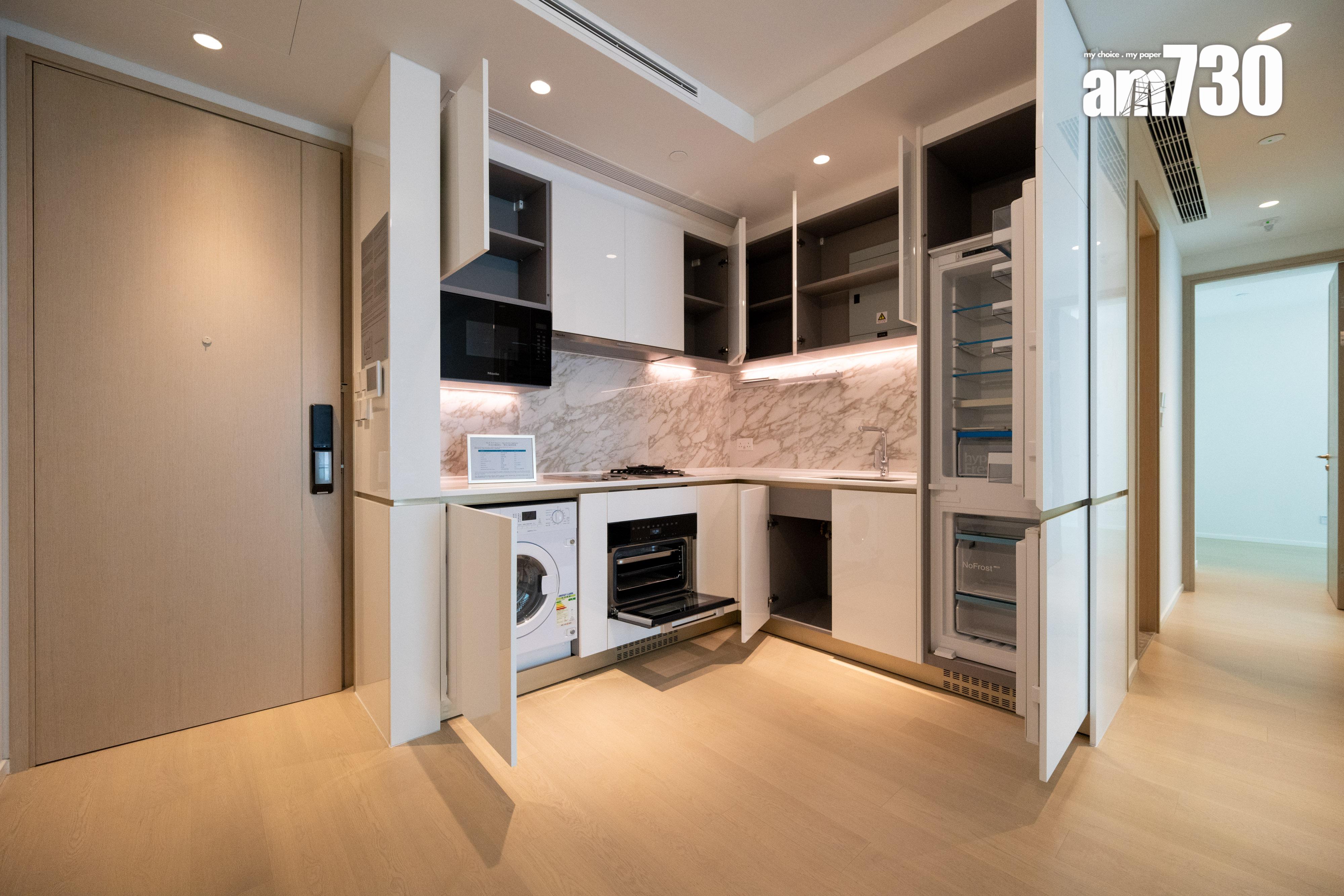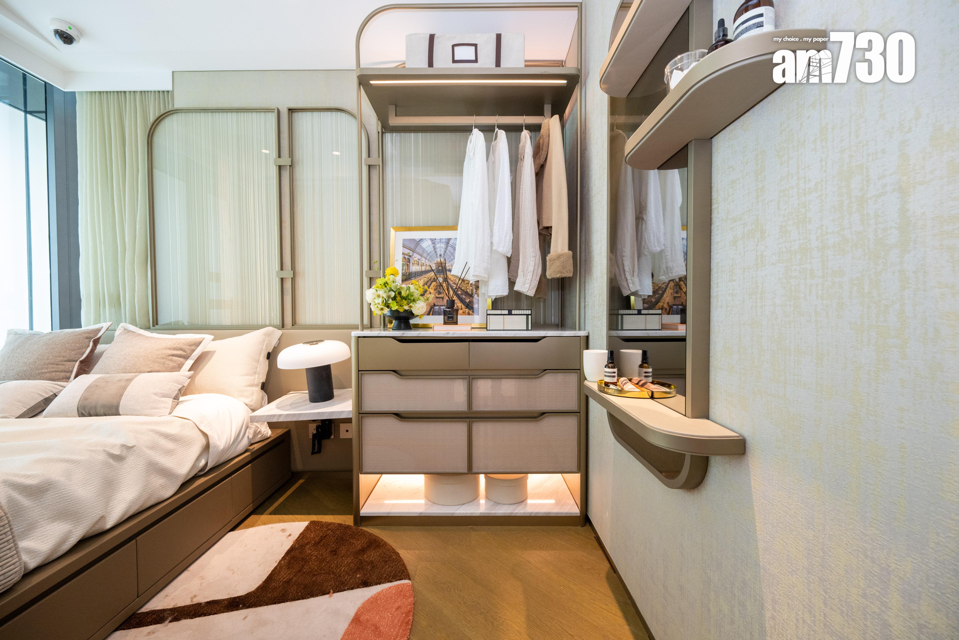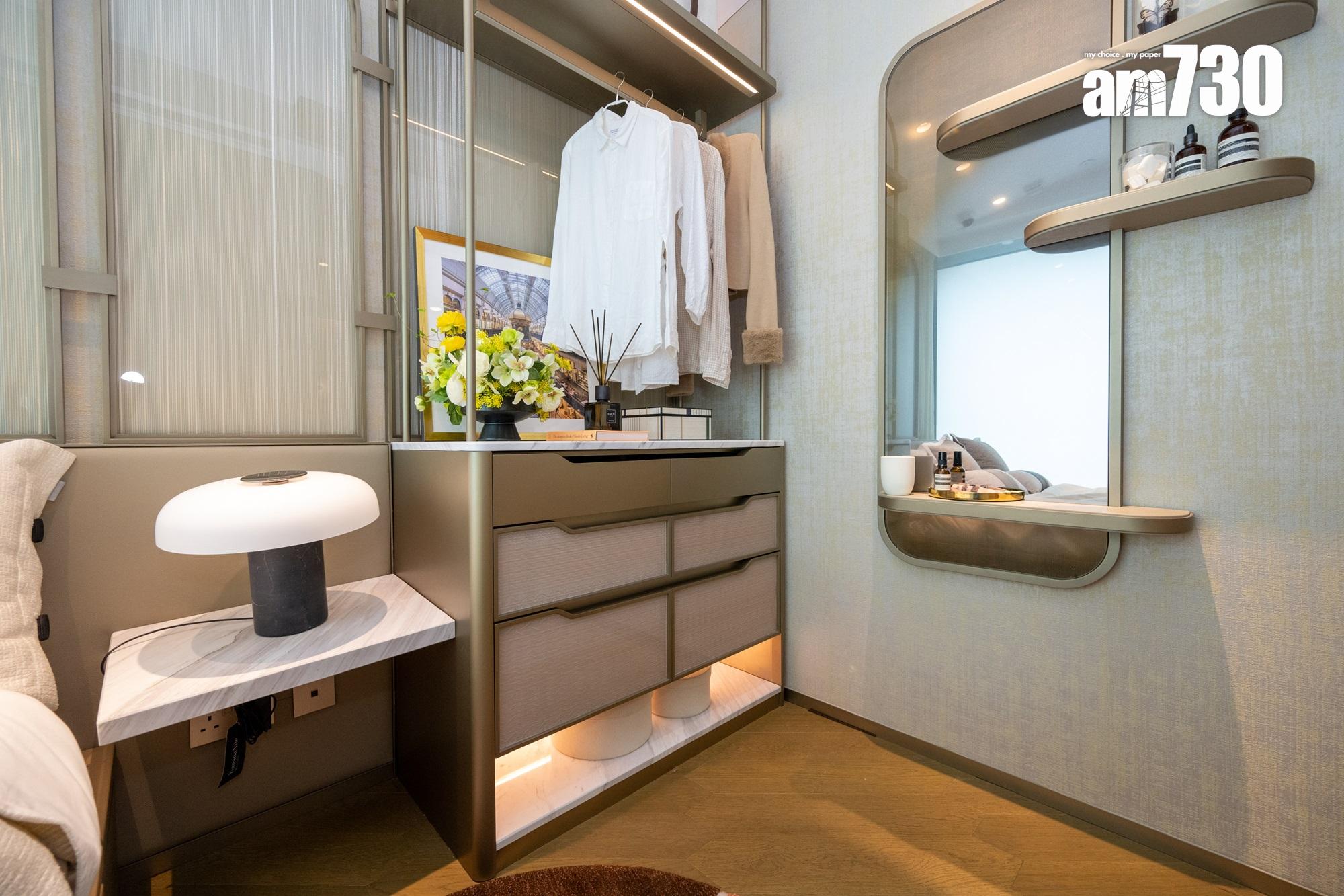另外,開放式廚房設特長L型工作枱面,備餐空間充足,項目全數單位選用國際高級品牌Miele 煮食爐具,更升級配備Miele蒸焗爐。此單位的開放式廚房可以明火煮食,適合喜歡下廚的住戶。至於主人睡房空間偌大,放置雙人床後可三邊落床,亦貼心預留衣櫃空間,主人浴室採明廁設計,大大提升採光度及通風。