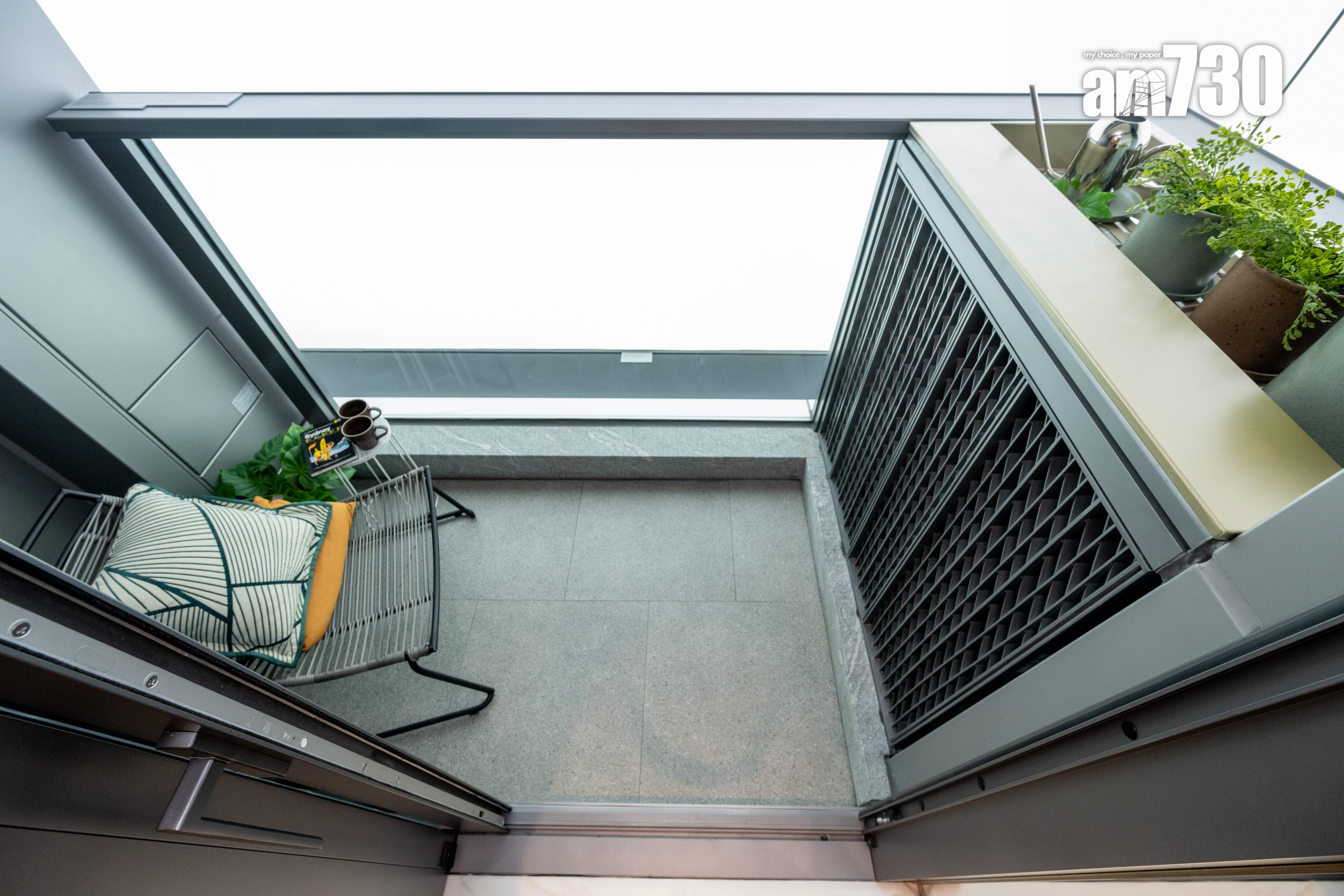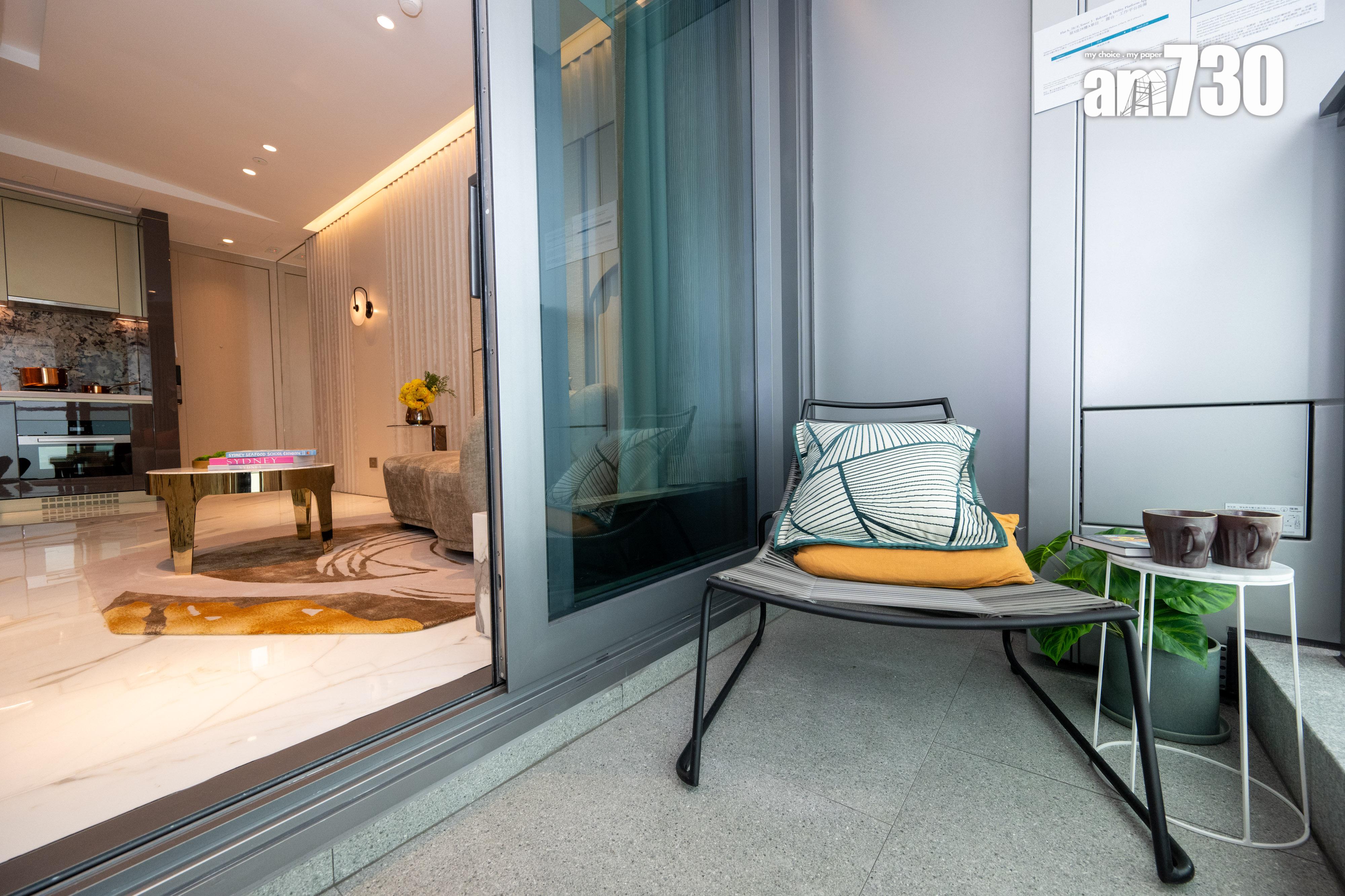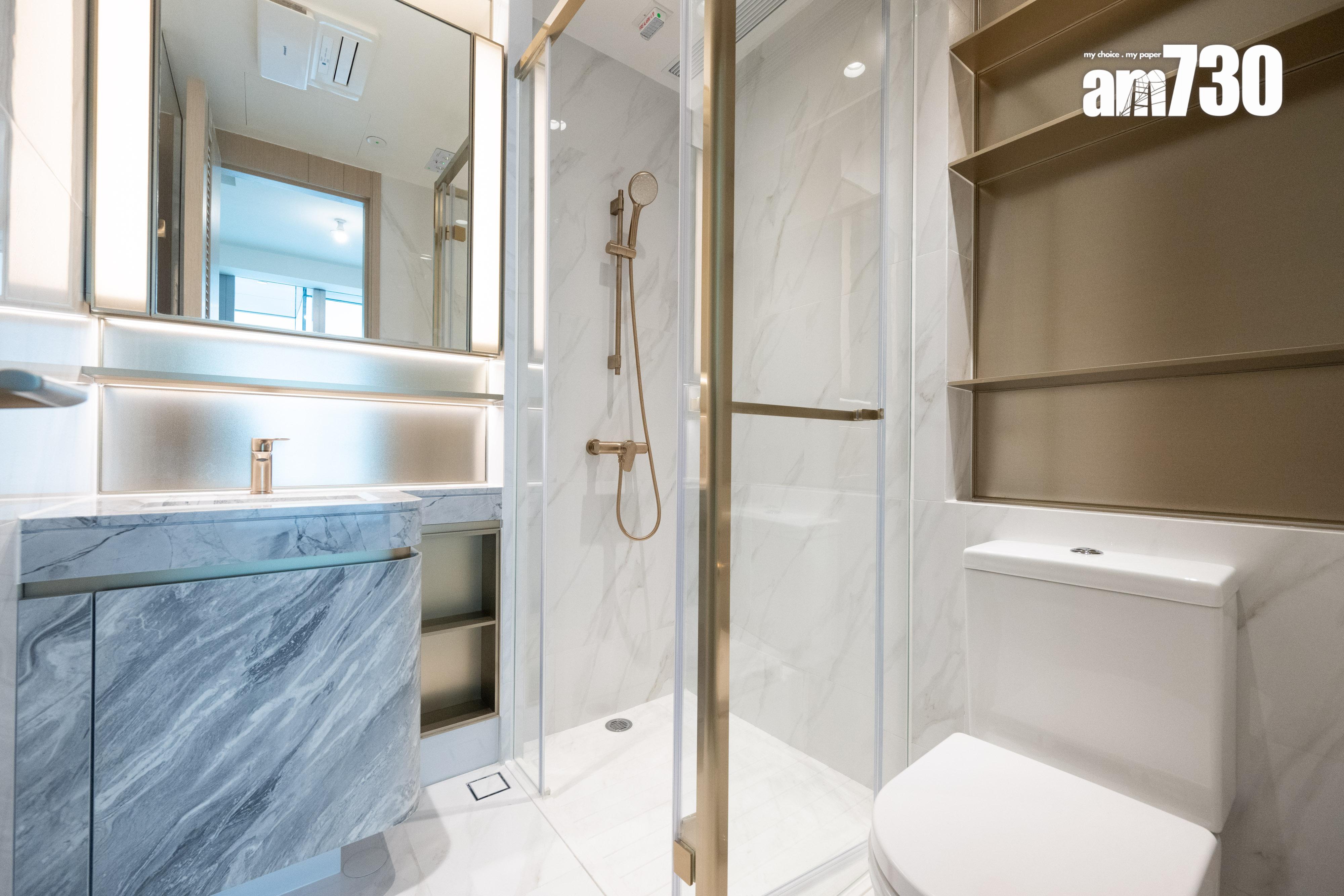 單位採「全寬度」三合一露台,令空間更實用,輕鬆打造户外休閒體驗。浴室牆身及檯面分別選用天然大理石材及石才鋪砌,盡顯奢華;主人睡房間隔方正實用,空間偌大,足夠空間放置衣櫃及梳妝枱;睡房配備線條簡約造型家具,配搭特色花紋牆紙。