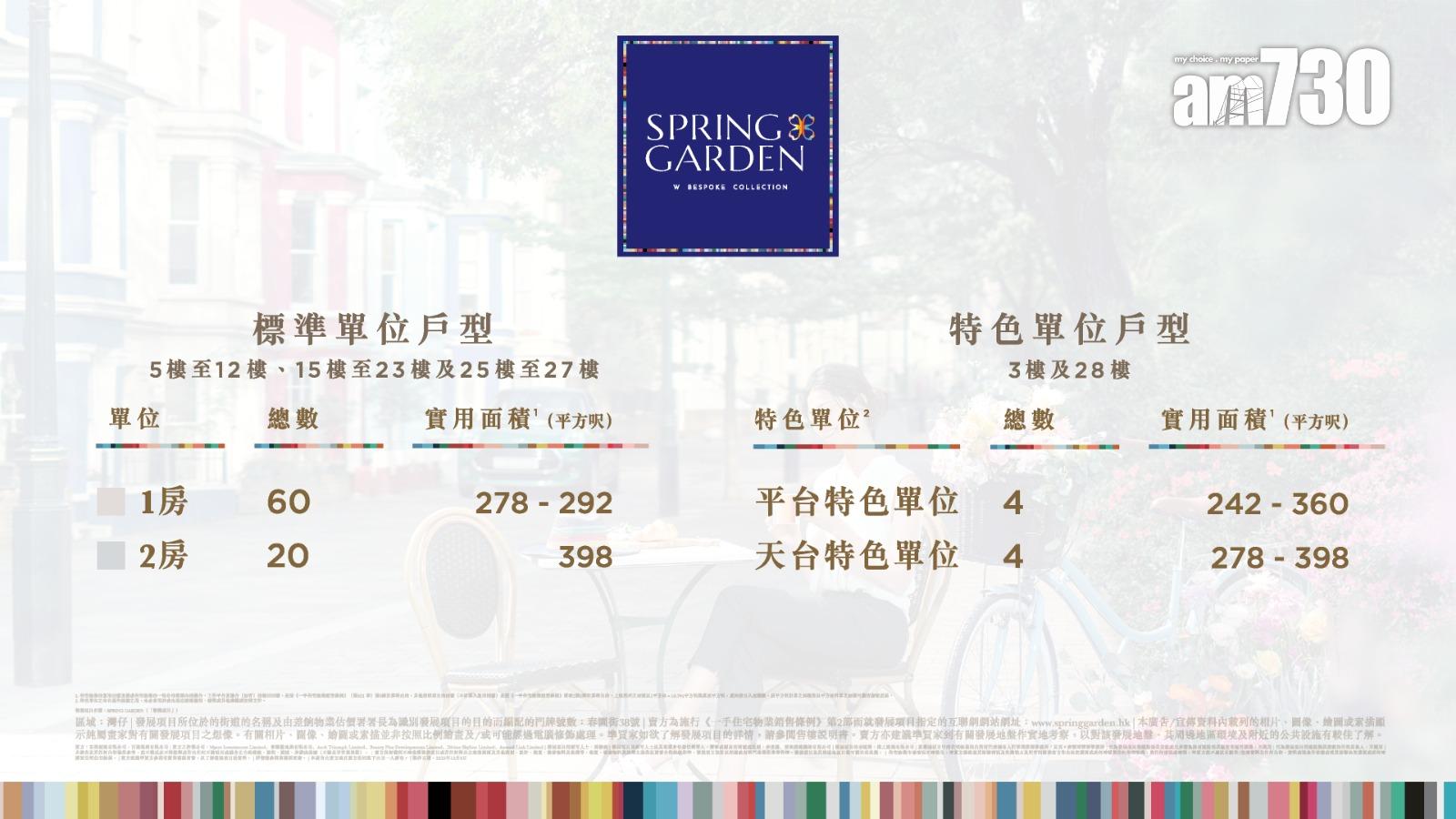 會德豐地產旗下灣仔新盤「SPRING GARDEN」,正式上載售樓說明書,提供88伙單位,涵蓋一房及兩房戶,另設特色戶,實用面積介乎242至398方呎。