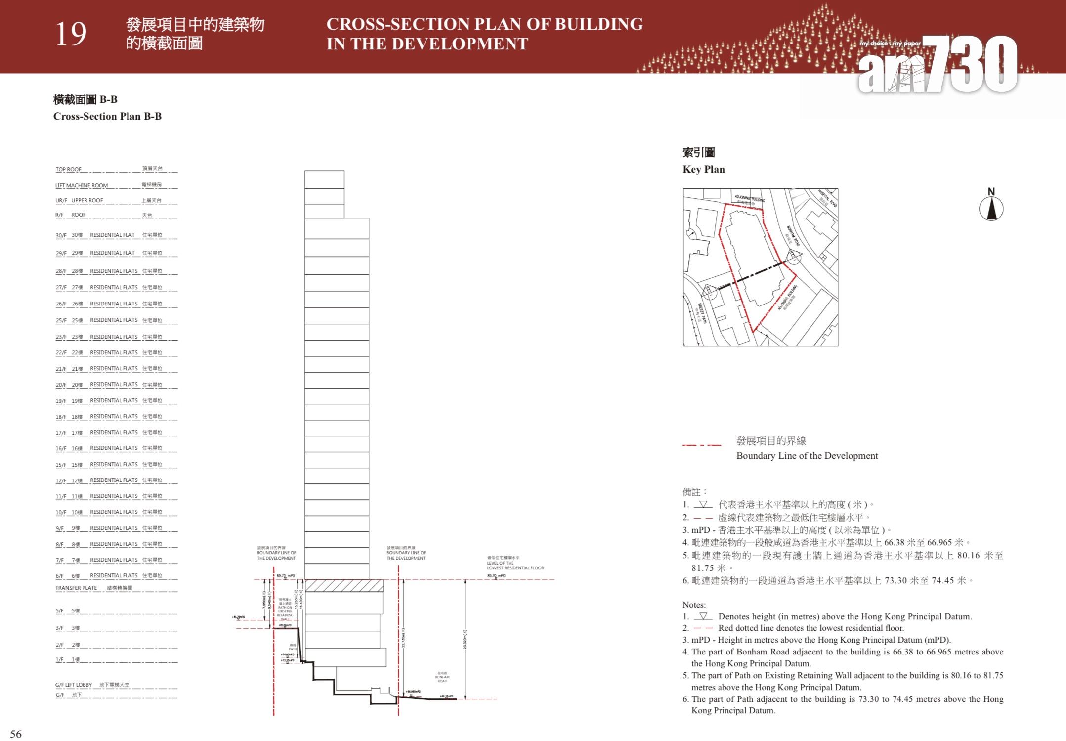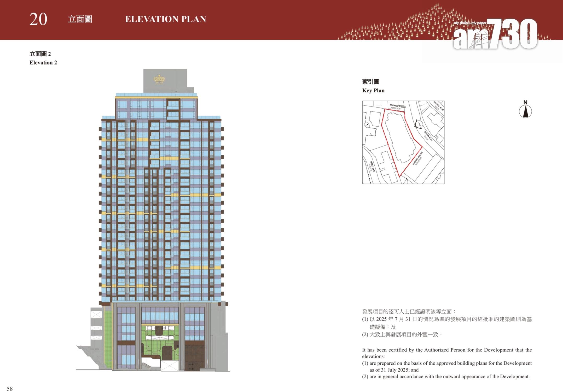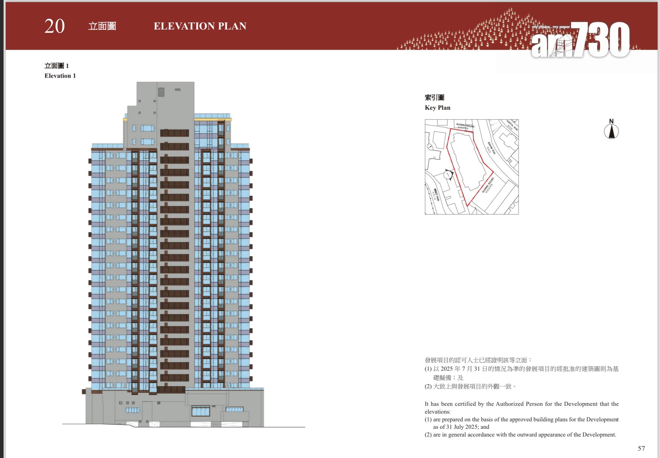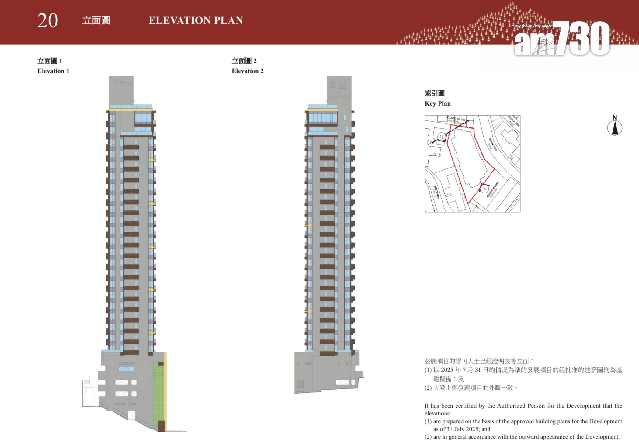 項目樓高27層,標準樓層一梯6伙,共用三部升降機。全盤面積最細單位為6樓E室,實用面積425方呎,連263方呎平台,為兩房連開放式廚房間隔;最大面積單位為30樓A室,實用面積2,990方呎,連2,308方呎天台,為五房連儲物室間隔,內置樓梯,設室外游泳池。