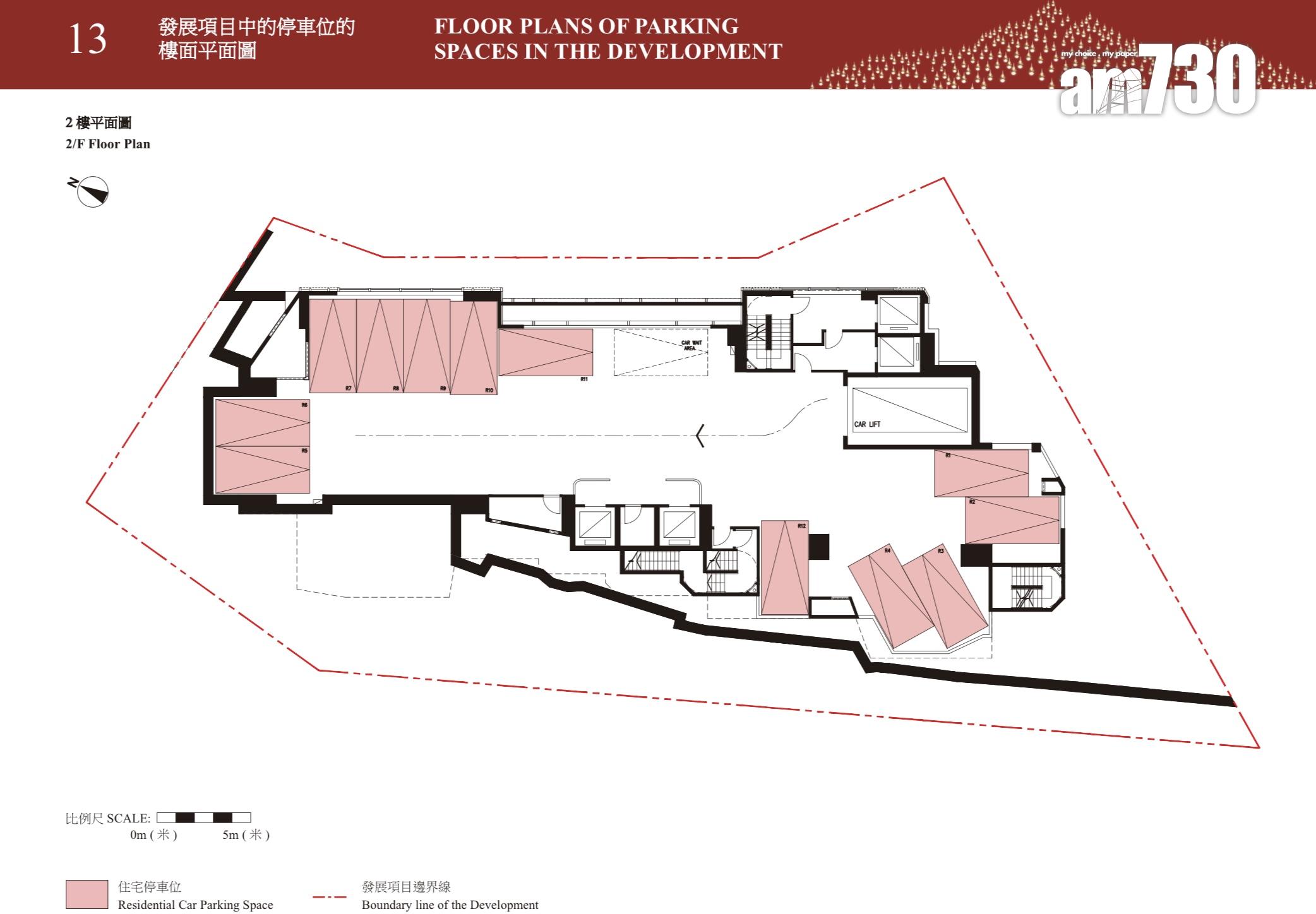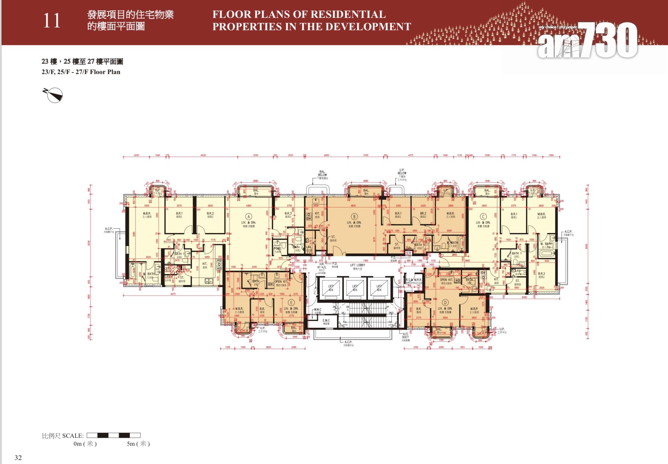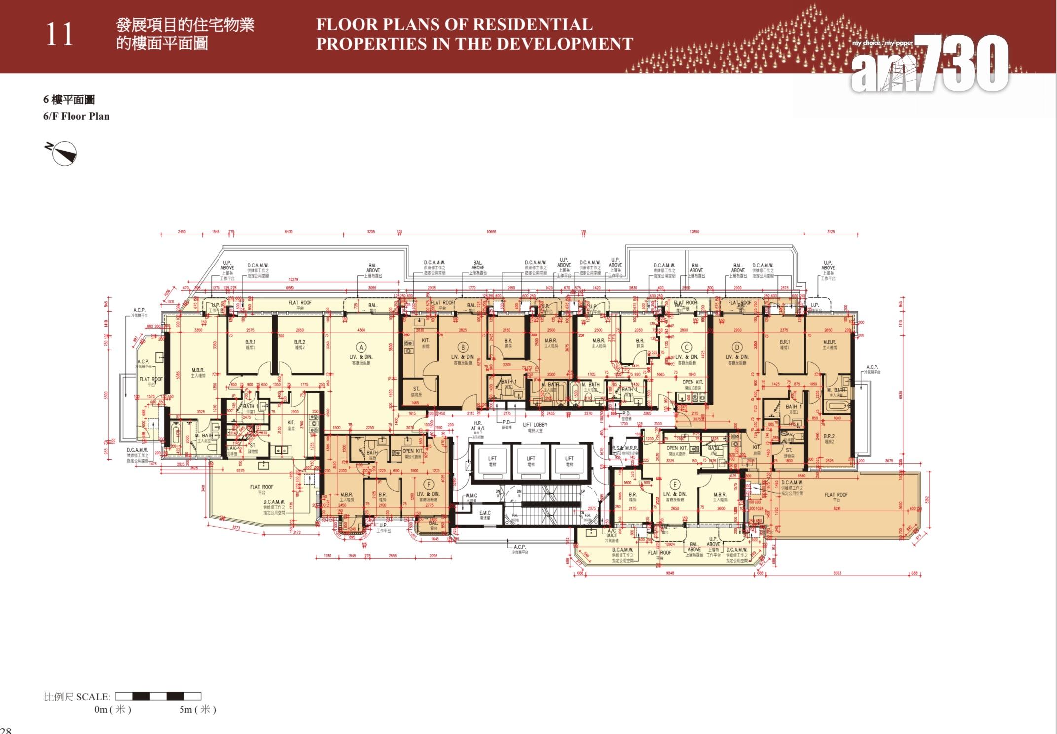 項目樓高27層,標準樓層一梯6伙,共用三部升降機。全盤面積最細單位為6樓E室,實用面積425方呎,連263方呎平台,為兩房連開放式廚房間隔;最大面積單位為30樓A室,實用面積2,990方呎,連2,308方呎天台,為五房連儲物室間隔,內置樓梯,設室外游泳池。