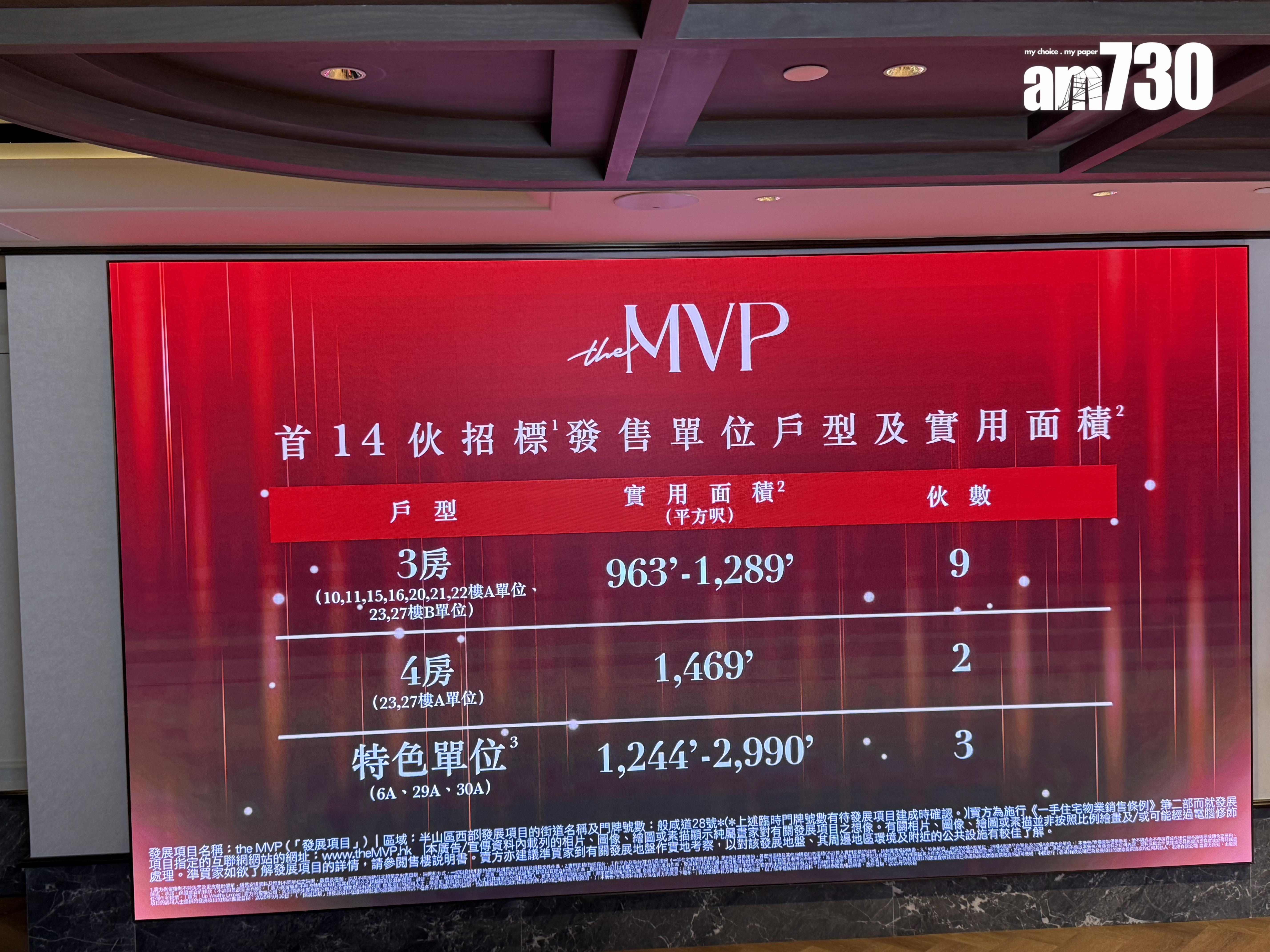 「theMVP」合共提供117伙,戶型涵蓋兩至四房,包括67伙兩房戶、39伙三房戶、4伙四房戶及7伙特色戶,實用面積由425至2,990方呎。
