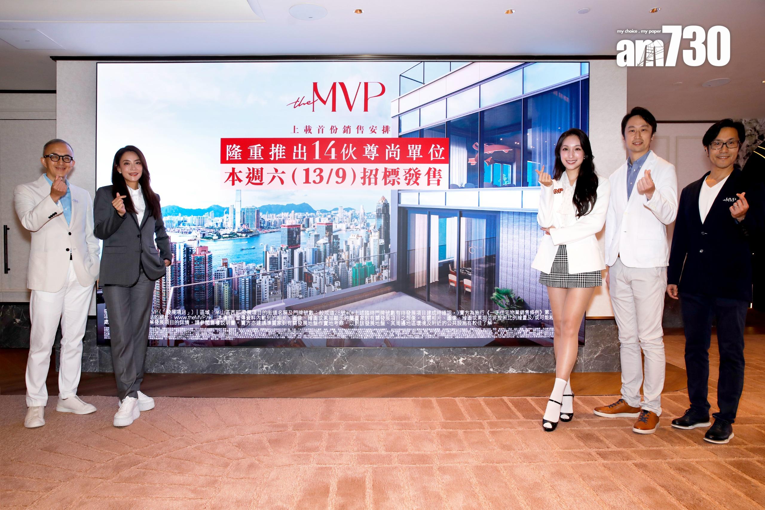 英皇娛樂集團營運總裁霍汶希(左二)聯同旗下藝人海兒(右三)出席最有價值港島半山豪宅項目「the MVP」記者會,與大家搶先欣賞有份拍攝的「Mid-leveller Citywalk」宣傳影片。英皇地產顧問方文彬(左一)和英皇地產銷售及市場總監柯穎豪(右二)即場宣佈上載首份銷售安排,推出14伙單位招標發售。