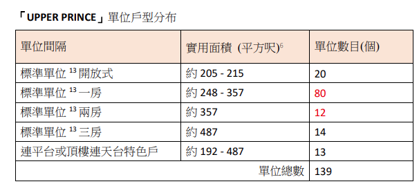 樂風集團旗下位於基隆街1號新盤「UPPER PRINCE」,上載售樓說明書,共提供139伙單位,標準單位涵蓋開放式至三房間隔,另設連平台或天台特色戶,實用面積192方呎至 487方呎。
