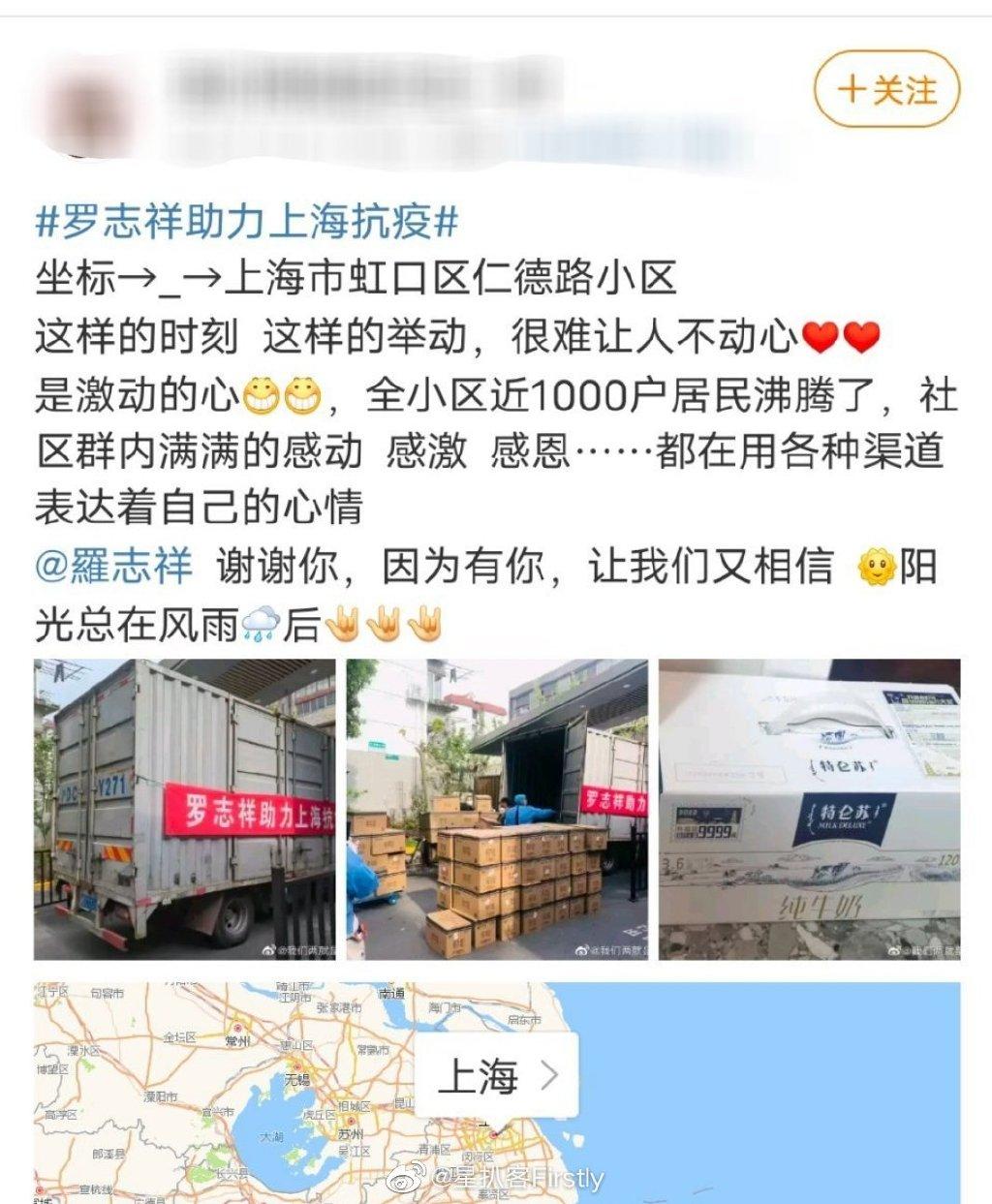 近日網上流出多張掛有「羅志祥助上海抗疫」紅布的貨車出入不同社區,並指有抗疫工作人員大叫「下來拿牛奶啦,這是台灣歌手羅志祥分發給我們的牛奶。」根據當地網民表示,在上海某小區的居民,獲發一箱牛奶、公仔麵及一些麵包。