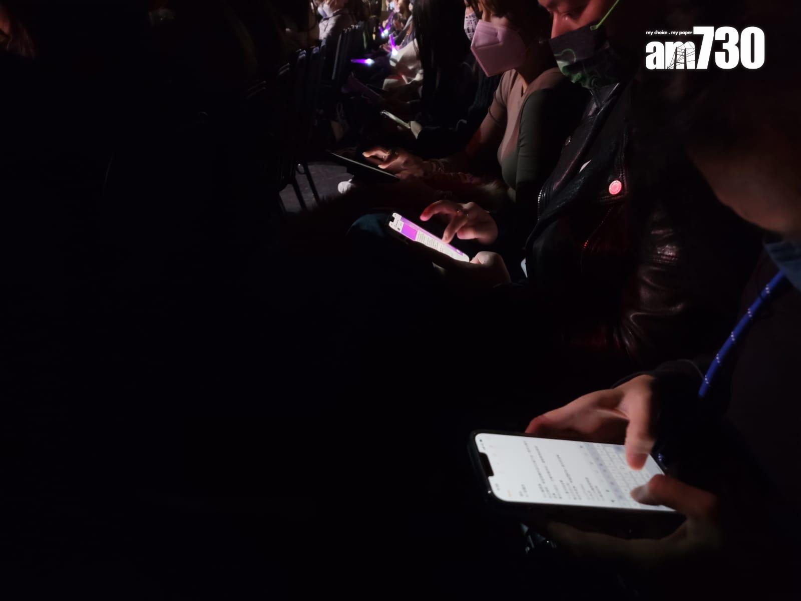 有在場人士用手機觀看直播。(陳奕釗攝)