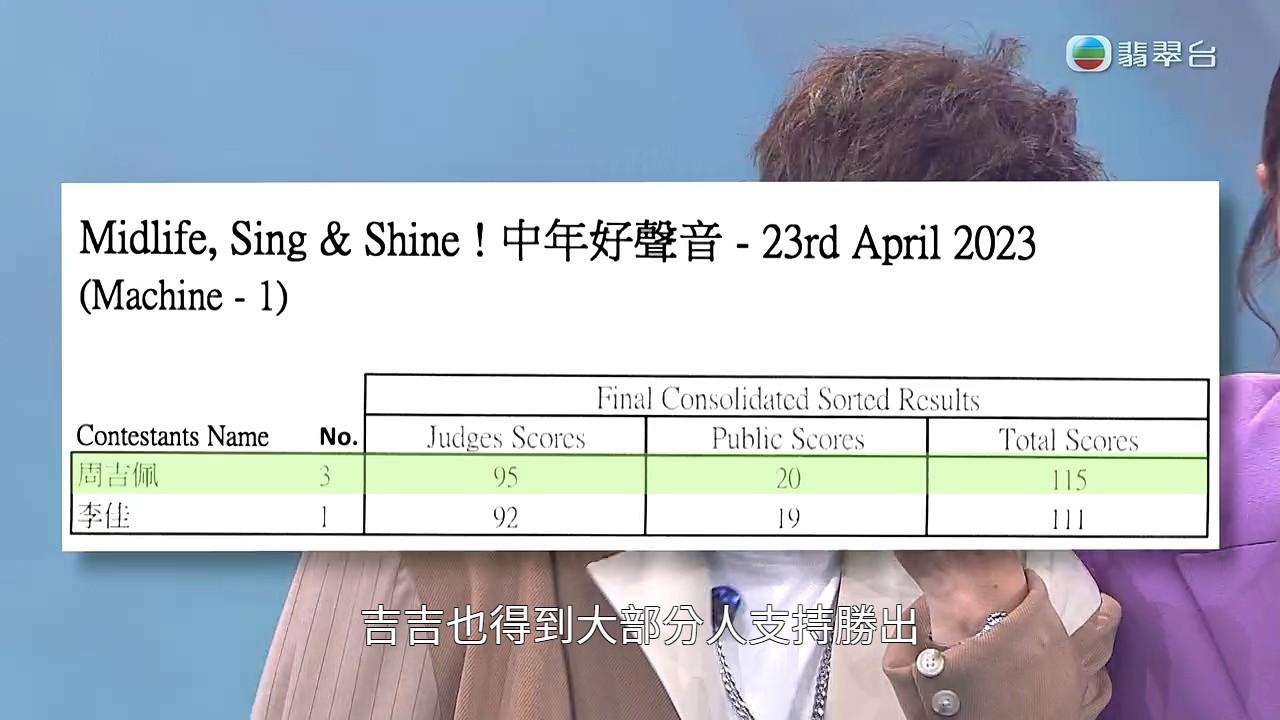 無綫真人騷《中年好聲音》於周日完滿結束,由周吉佩爆冷奪冠,大熱的龍婷及李佳僅獲「觀眾最愛好聲音」及亞軍。 由於吉吉由參賽到決賽一直並非頂頭大熱,加上為增加刺激感,大會於直播當晚並沒有公開6強於快歌競賽部分分數,以及最後兩強對決的分數細節(只公布了最終回的整體分數,並沒有詳細列明二人的評審得分及觀眾投票得分),遂惹來質疑,引發熱話。