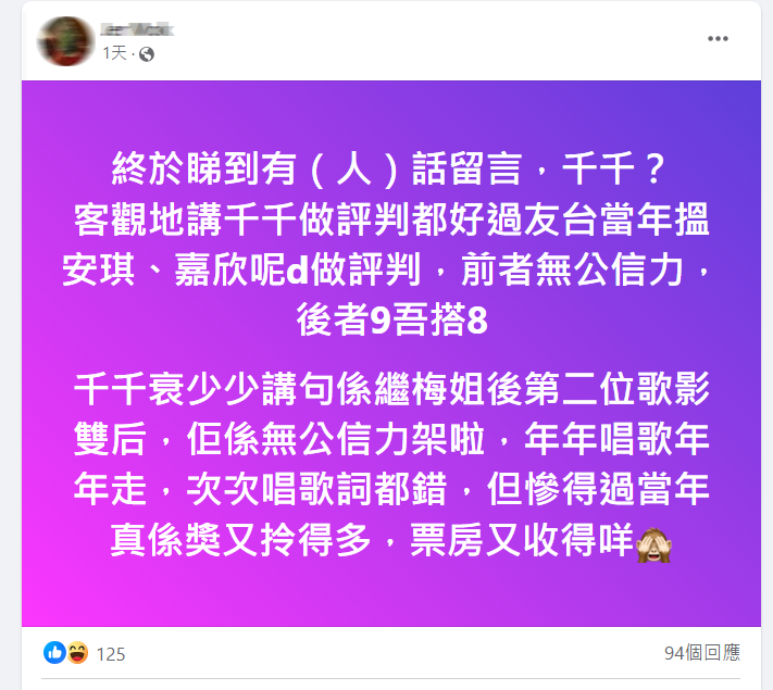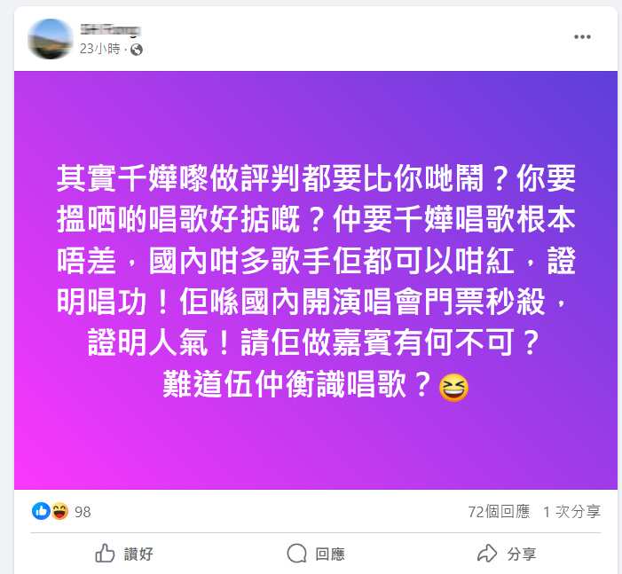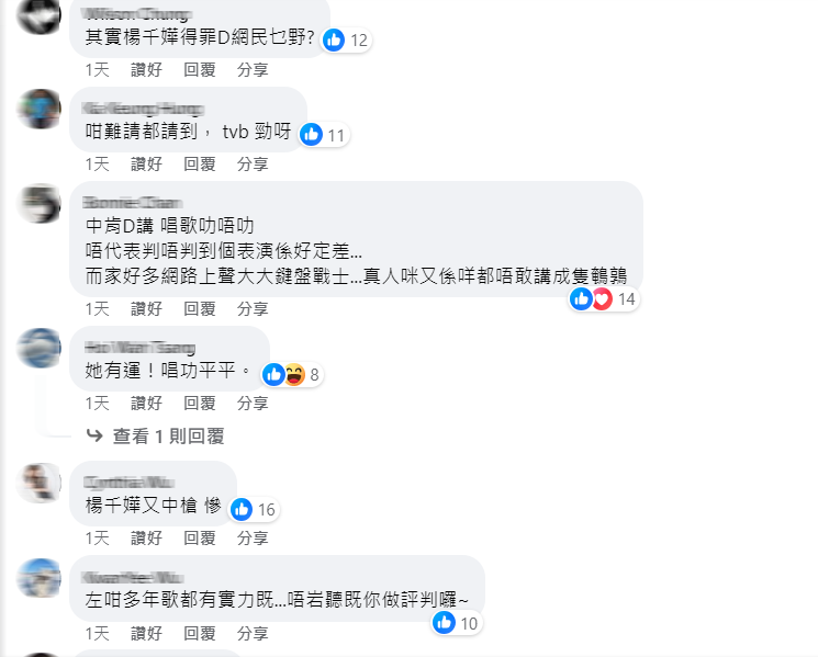 有網民估計,主辦單位為了谷節目收視才請楊千嬅,亦有人指以對方在大陸的人氣,請她擔任嘉賓也是想吸引多些內地觀眾。有網民留言謂︰「唔走音唔扮喊唔唱錯歌詞已經可以攞到滿分」、「千嬅唱得差過林若盈」、「楊千嬅都成日走音。點可以搵佢做評判呀。TVB唔該你哋唔好玩嘢啦!」、「叫楊千千去參加《中年好聲音3》,未必入到最後7強!」