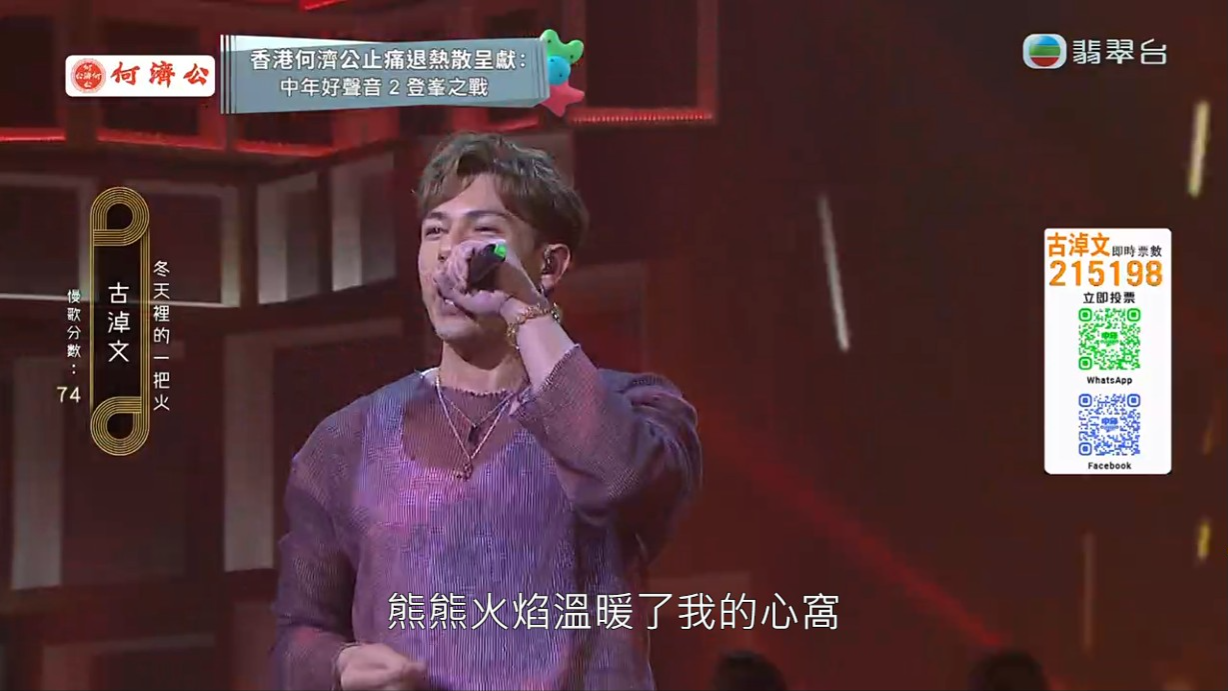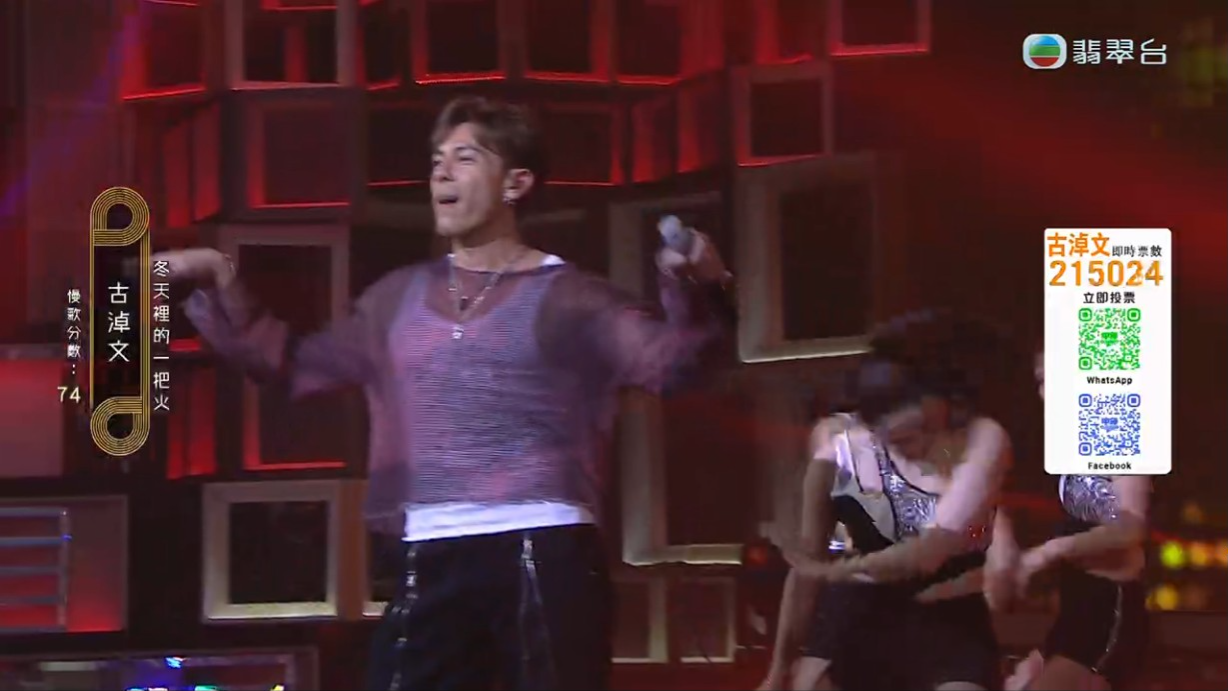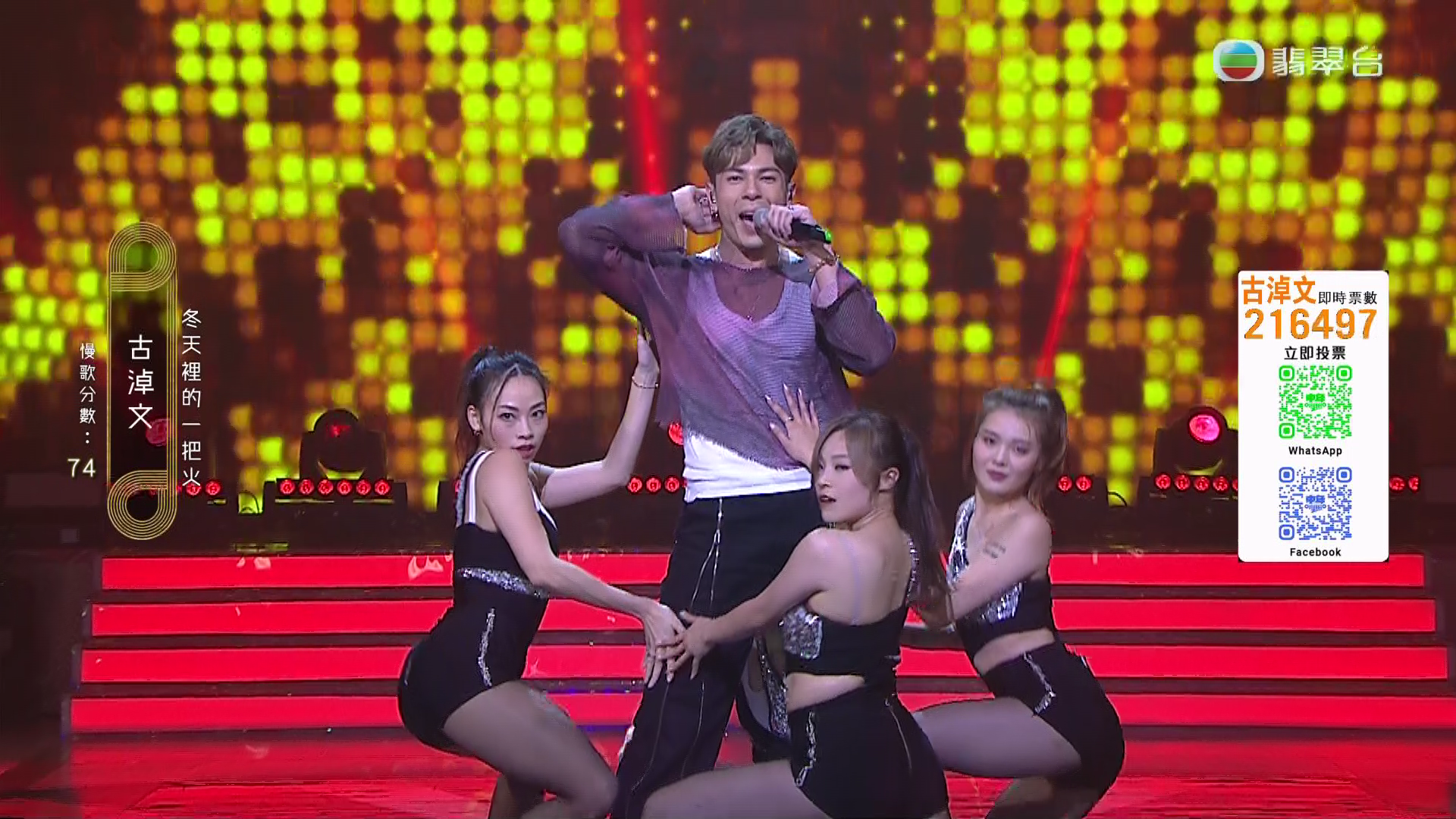 古淖文以see through魚網衫跳唱《冬天裡的一把火》,伍仲衡表示他的表現很好,像有多年舞台經驗;張佳添指他在台上有star的感覺。黃劍文以《玩火》迎戰,千嬅表示沒想到參賽者的快歌表演更好看,她讚劍文進步了很多,完全不像她認識的劍文,對他大為欣賞。
