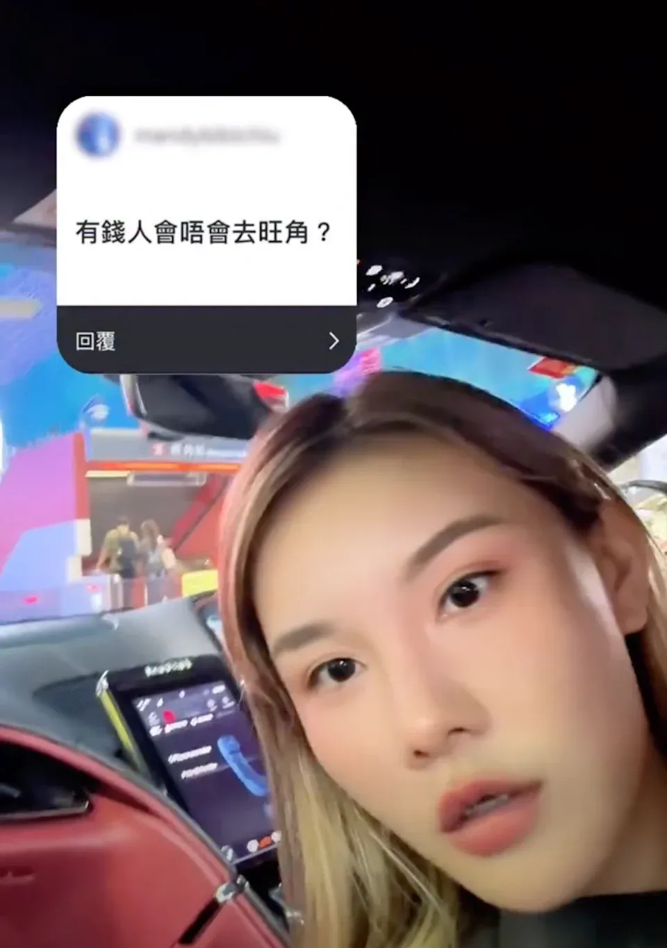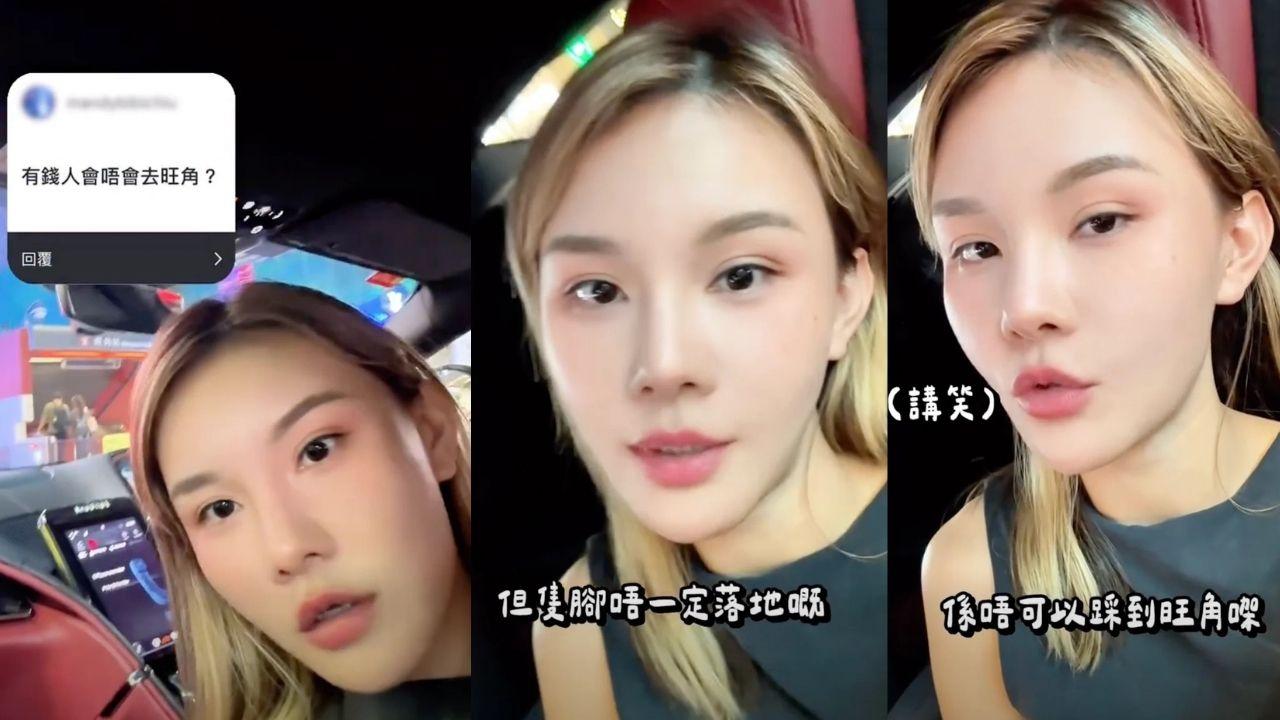 回到話題本身,五索話「有錢人梗係落旺角,但隻腳唔一定落地,因為隻鞋係名牌,唔可以踩到旺角架」,但就喺畫面括住「講笑」。五索有馬生幫佢買嘢飲,仲自拍美腿、名牌高跟鞋同馬生架靚車內籠,好識炫。