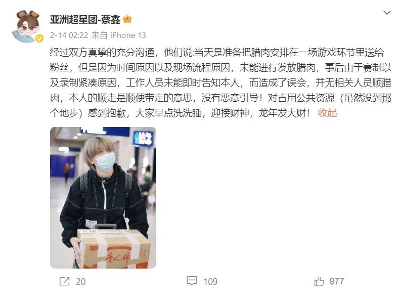 臘肉失蹤事件最後嚟個大反轉,蔡鑫喺微博再出PO表示係一場誤會:「經過雙方真摯的充分溝通,他們說當天是準備把臘肉安排在一場遊戲環節裏送給粉絲,但是因為時間原因以及現場流程原因,未能進行發放臘肉,事後由於賽制以及錄製緊湊原因,工作人員未能即時告知本人,而造成了誤會,並無相關人員順臘肉,本人的順走是順便帶走的意思,没有惡意引導!對佔用公共資源(雖然没到那個地步)感到抱歉,大家早點洗洗睡,迎接財神,龍年發大財!」