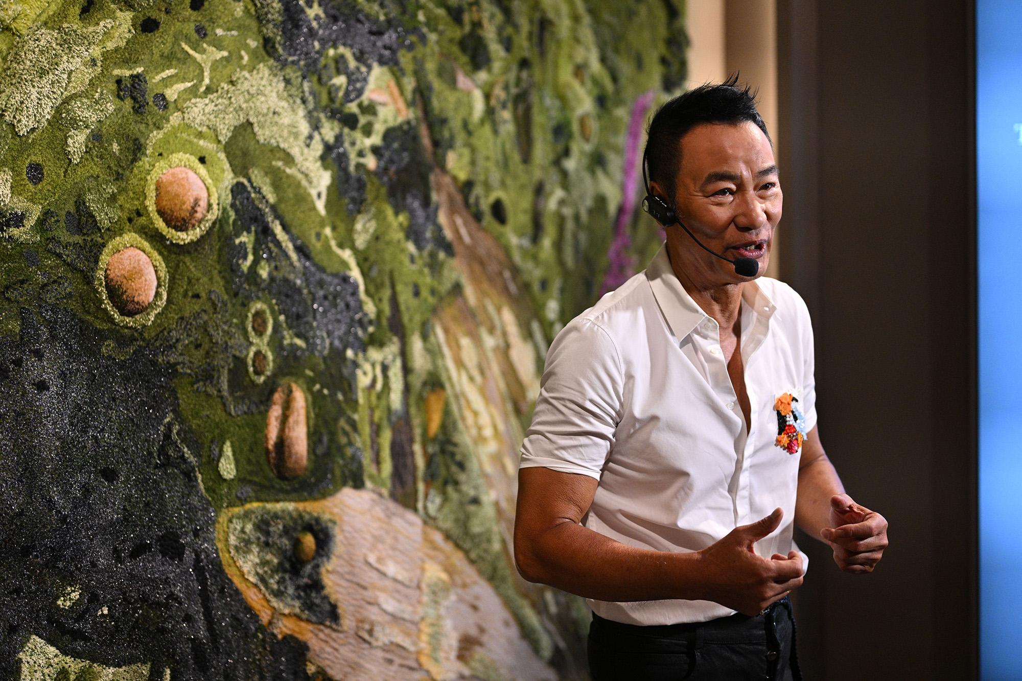 任達華表示很開心見到不同界別的朋友來支持,同時亦很高興可以跟不同設計師合作。他笑謂自己出生的年代,色彩很迷人,加上60年代是黑白電視機,予人像水墨畫,之後再出現彩色電視機,為大家帶來彩色世界,因此自己的畫作有不少是眼睛,喻意看到不同顏色的世界。