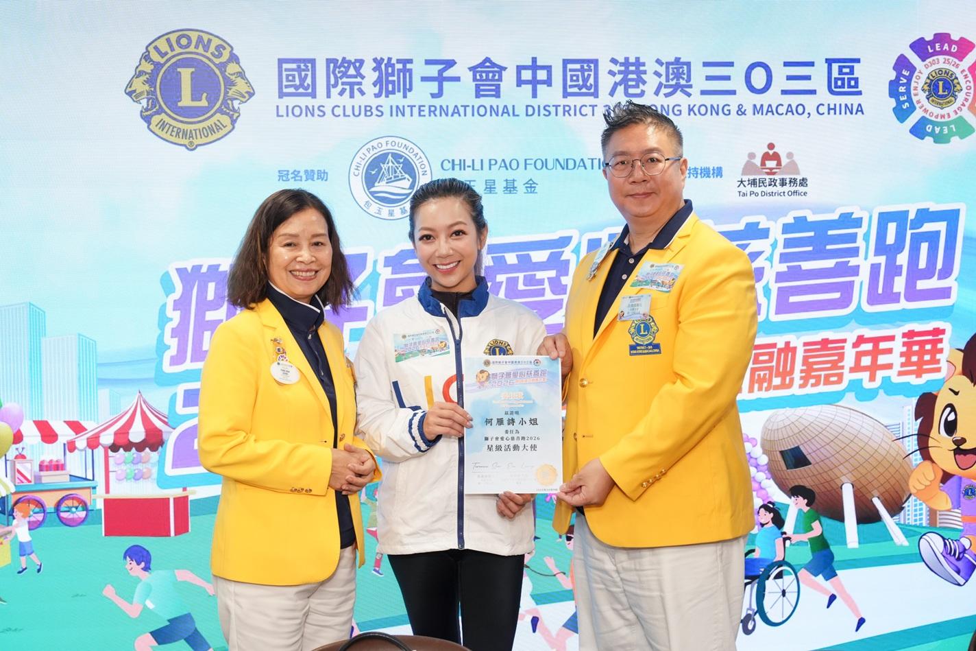 曾是高爾夫球港隊代表何雁詩,兒子雖然被診斷患上罕見基因突變病天使綜合症,她與丈夫鄭俊弘均正面面對事情,更不時為特殊兒童活動出力,因此答應擔任星級大使宣傳《獅子會愛心慈善跑2026》。她在台上表示,「我本身都是特殊需要兒童的家長,有想過如何利用自身事業去幫助傷健共融,以自己人脈網絡去推廣,令到大家知道其實可以大家一齊生活之外,更加需要多些同理心。見到今次有一項6人傷健的共融賽,覺得是一個好好進步,希望可以叫貞哥(活動大使姚潔貞)抱住我個仔一齊跑。」