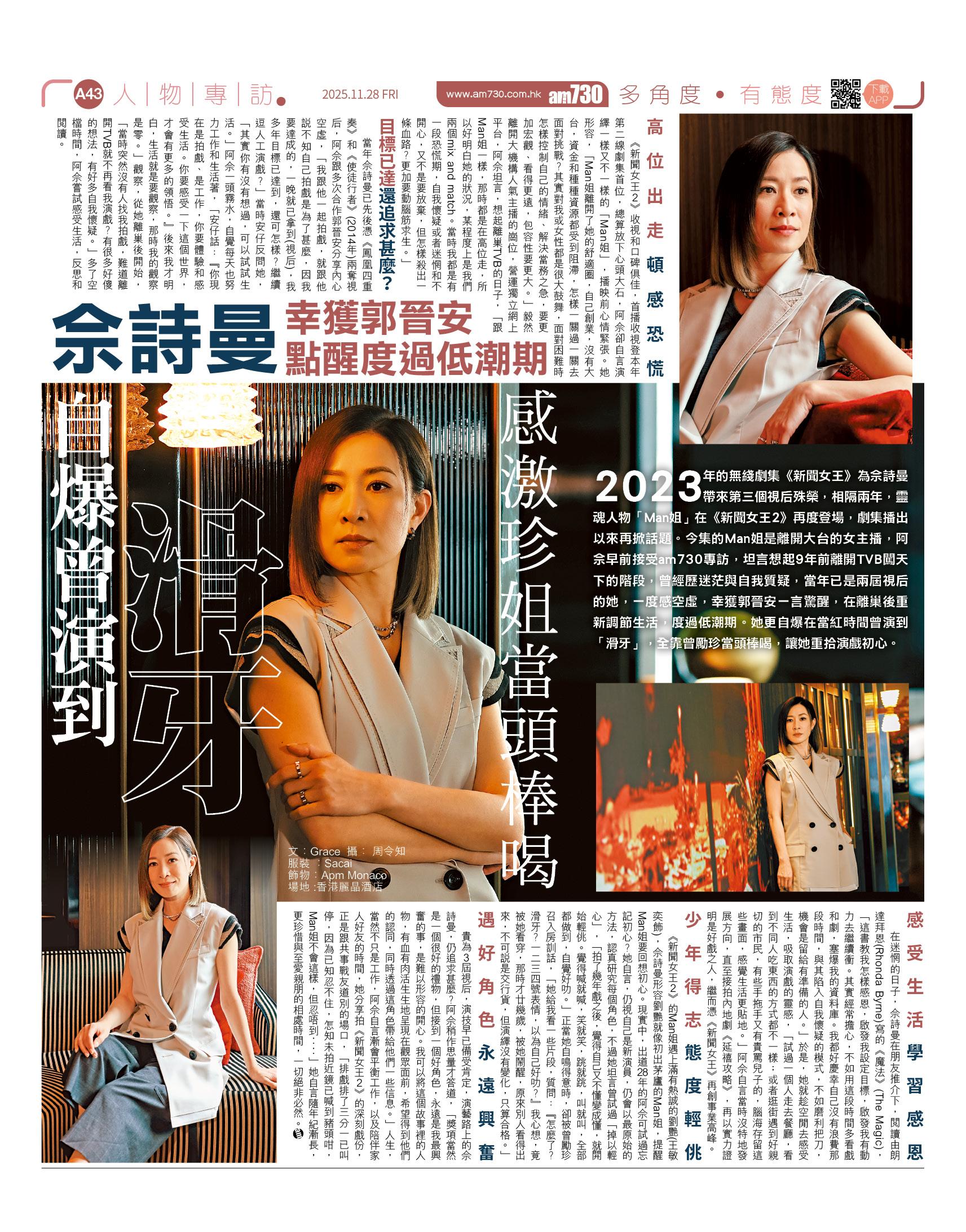 貴為3屆視后,演技早已備受肯定,演藝路上的佘詩曼,仍追求甚麼?阿佘稍作思量才答道,「獎項當然是一個很好的禮物,但接到一個好角色,永遠是我最興奮的事,是難以形容的開心。我可以將這個故事裡的人物,有血有肉活生生地呈現在觀眾面前,希望得到他們的認同,同時透過這角色帶給他們一些信息。」人生,當然不只是工作,阿佘自言漸會平衡工作,以及陪伴家人好友的時間,她分享拍《新聞女王2》的深刻戲份,正是跟共事戰友道別的場口,「排戲排了三分一已叫停,因為已知忍不住,怎知未拍近鏡已喊到豬頭咁,Man姐不會這樣,但忍唔到……」隨年紀漸長,難免遇上生離死別,自幼喪父,視為契爺的許紹雄於10 月28日離世,阿佘更珍惜與至愛親朋的相處時間,「我會分配時間,珍惜和每個人的相處時間,以前不會的,只有工作、工作再工作,例如拍完劇宣傳期就會陪媽媽,其實現在她也很忙,夾到時間都會一齊去旅。」