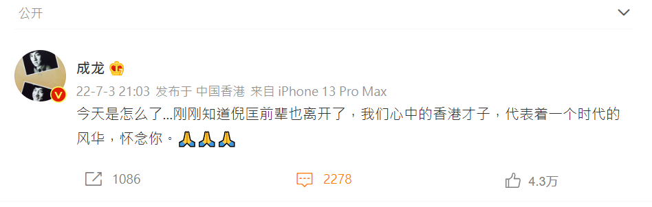 成龍寫道︰「今天是怎麼了...剛剛知道倪匡前輩也離開了,我們心中的香港才子,代表著一個時代的風華、懷念你。」由於他同日得知著名導演兼編劇羅啟銳亦離世,所以連發兩則帖文,但沒想到遭大陸網民斥他「甚麼人都哀悼,毫無原則立場。」其餘的留言有︰「反共反中的犯罪分子,值得你這麼哀悼懷念?」、「這貨不值得悼念,這波不站龍哥!」