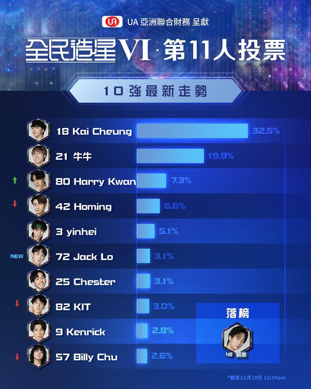 ViuTV選秀節目《全民造星VI》進入尾聲,昨晚一集已有20強誕生,今屆特別為被淘汰的參賽者設立投票機制,得票最多的可成為「第11人」直入決賽。目前為止,已有多位人氣參賽者慘被淘汰,當中包括大熱之一的牛牛(周德誠),而今晚公布「第11人」的最新十強走勢,人緣不差的Kai Cheung(張家文)仍保持冠軍席位,拋離牛牛及Homing(姚浩銘),而Harry Kwan(關誌諾)目前票數已超越Homing打入三甲位置。對此,25歲的Kai Cheung日前已留言答謝大家支持,出story寫:「我唔知講咩好…好似成世人一直好努力做某啲事情,今日我終於得到些少成果。短短嘅時間,大家嘅支持我都看見了,好多謝你哋!」Kai還應承不會白費大家心機。