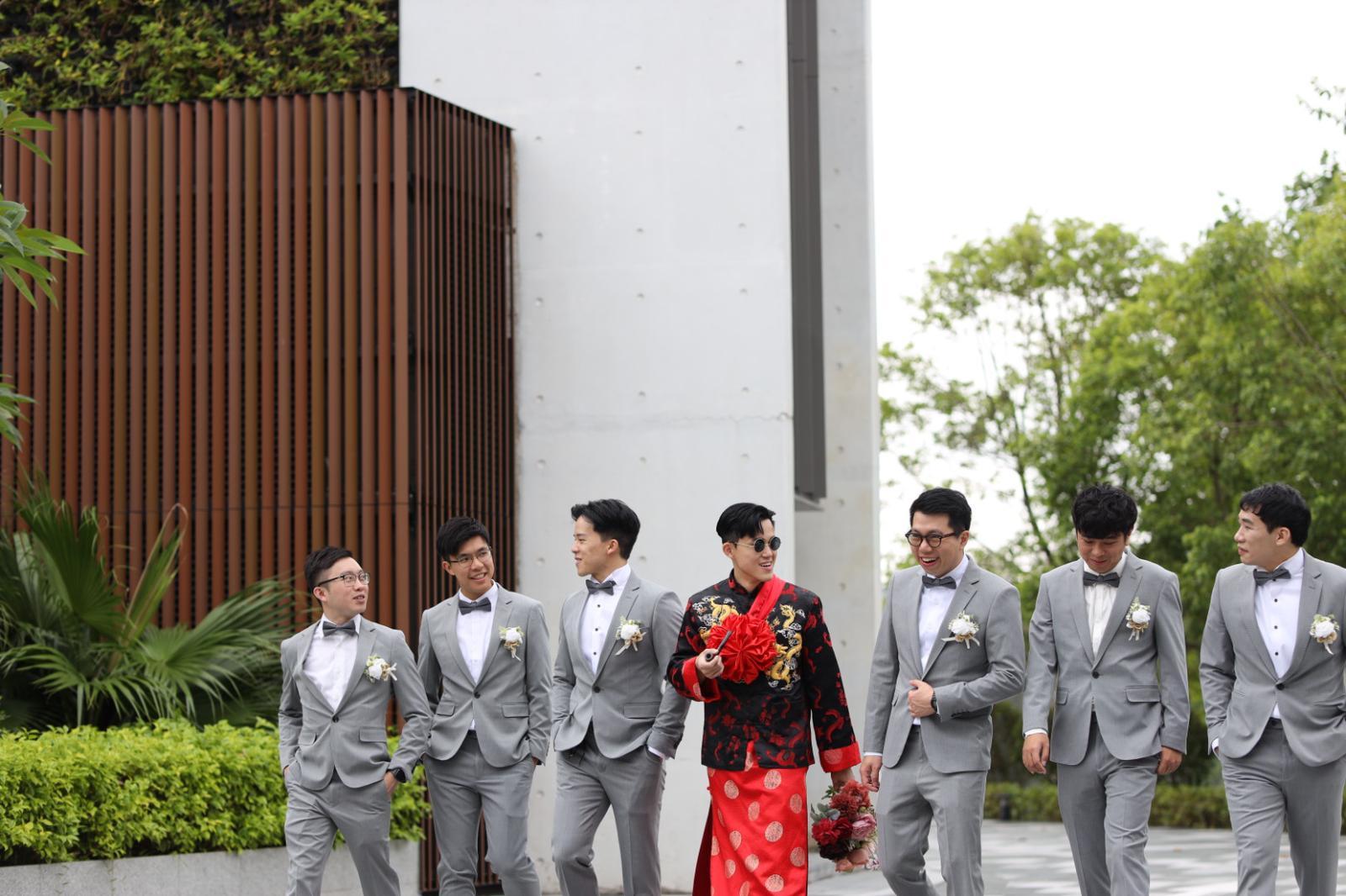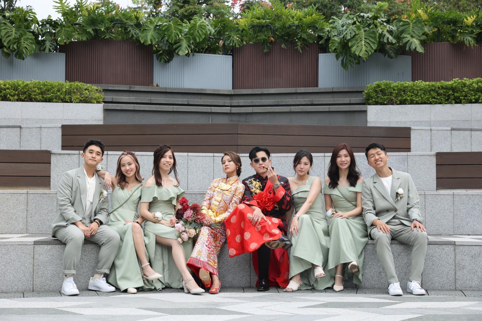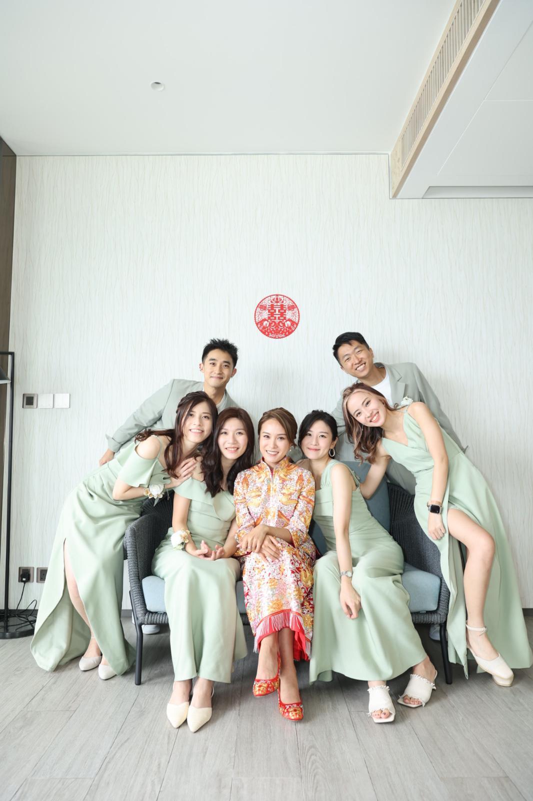 丘靜雯老公為免太太搶盡風頭,他就靠外型取勝,戴上圓形黑超及擔住煙斗,玩味甚濃,並與多位兄弟姊妹擺出不同甫士拍照。從他們發布的照片所見,丘靜雯跟媽媽長得餅印一樣,而爸爸更面露不捨之情,攬實愛女送上祝福,場面非常溫馨。