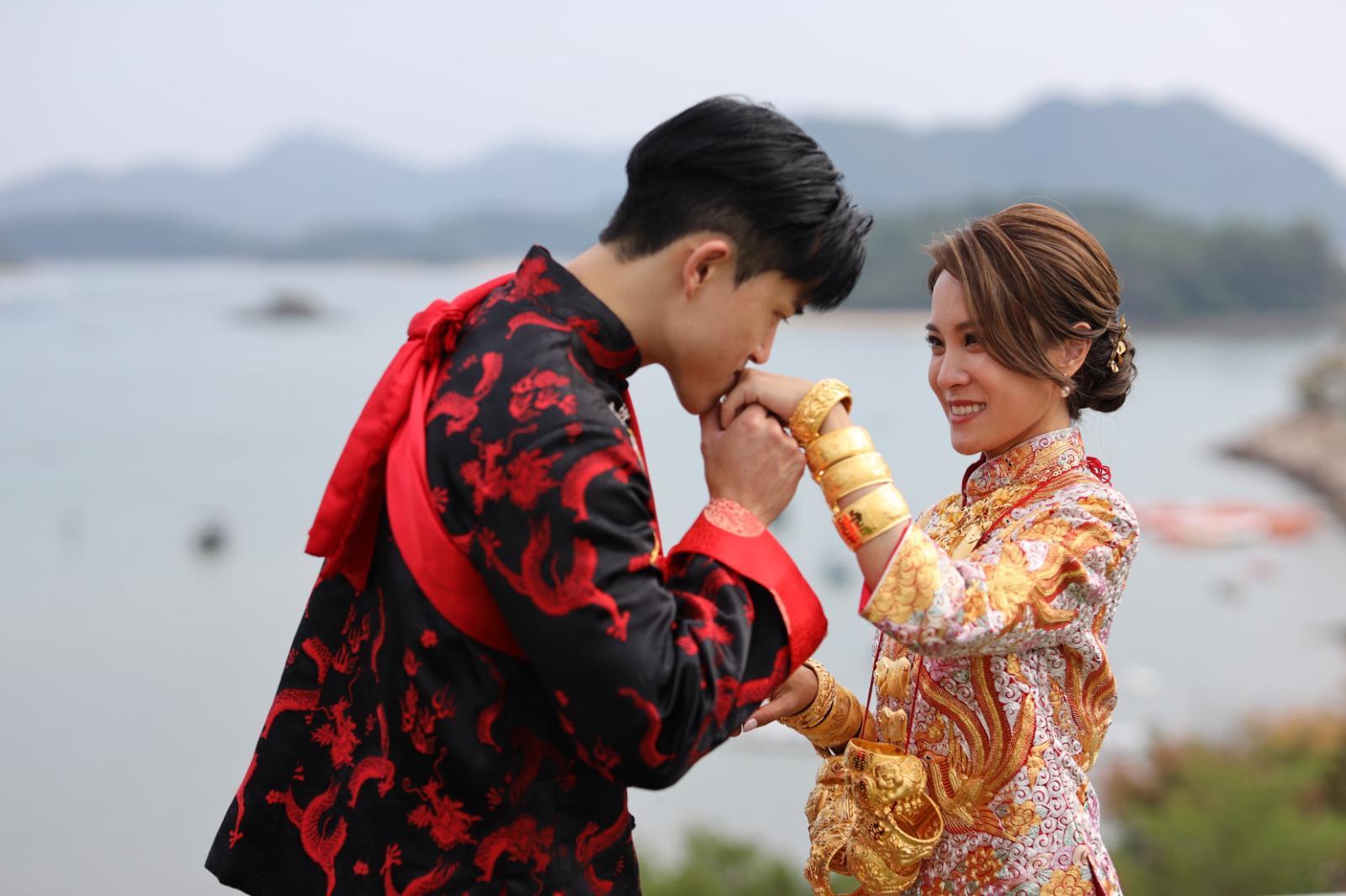 前nowTV新聞主播丘靜雯於去年9月宣布答應男友阿楓求婚,今日二人舉行婚禮。他們按照傳統穿上中式裙褂和禮服,丘靜雯雙手戴上4對龍鳳鈪,身上再掛有金豬牌及多對龍鳳鈪,當中更有兩對是「流星鎚」,份量十足。