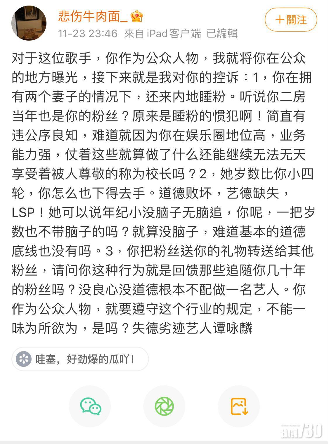 網民在文中指女友比該名男歌「小四輪」,質問對方:「你怎麼也下得去手。道德敗壞,藝德缺失,LSP!她可以說年紀小沒腦子無腦追,你呢,一把歲數也不帶腦子的嗎?就算沒腦子,難道基本的道德底線也沒有嗎?」此外,他稱該名歌手會把粉絲的禮物轉送給其他粉絲,批評他沒良心、沒道德,根本不配做一名藝人。最後他點名說:「你作為公眾人物,就要遵守這個行業的規定,不能一味為所欲為,是嗎?失德劣跡藝人譚詠麟!」最後他公開了兩張疑為「譚詠麟」的照片以作佐證。
