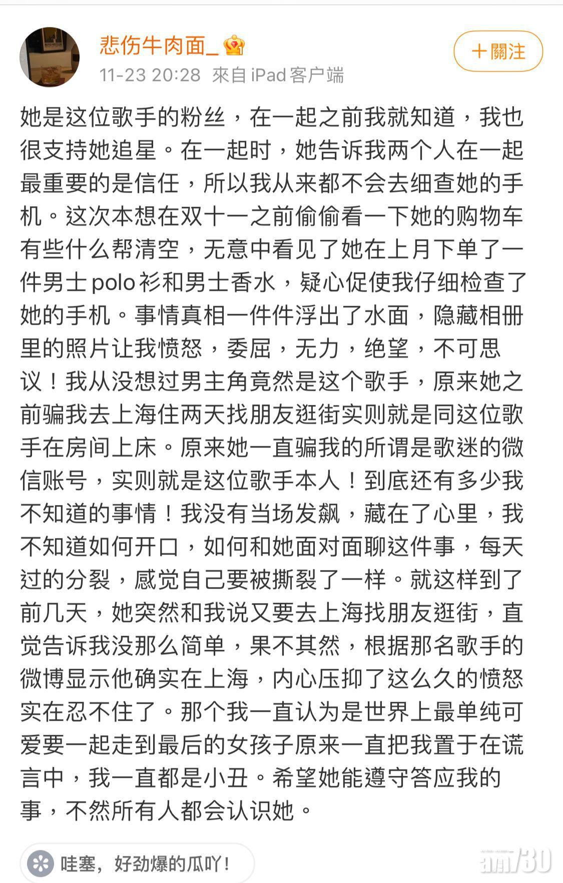 該名網民在微博連續發了7則帖文,其中一則帖文提到他發現女友買了一件男士polo衫和男士香水,於是檢查女方的手提電話,在隱藏相冊裡發現了屬於某位香港男歌手的照片,並稱其女友暪騙他去上海住兩天找朋友,原來是跟一位香港男歌手在房間上床。