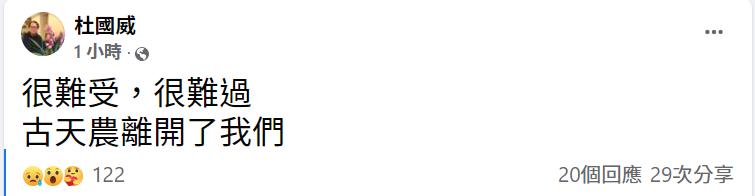 前中英劇團藝術總監、資深舞台劇資員及導演古天農昨日離世,終年69歲。其死訊由著名編劇杜國威在網上公佈,二人曾合作多齣著名舞台劇,包括《我和春天都有約會》、《南海十三郎》等,更多次在舞台重演,是香港最受歡迎的舞台劇之一。據悉古天農昨日曾向家人表示有點不舒服,最後在睡夢中離世。其死訊一出震驚業界,與他合作過的台前幕後都深感難過。