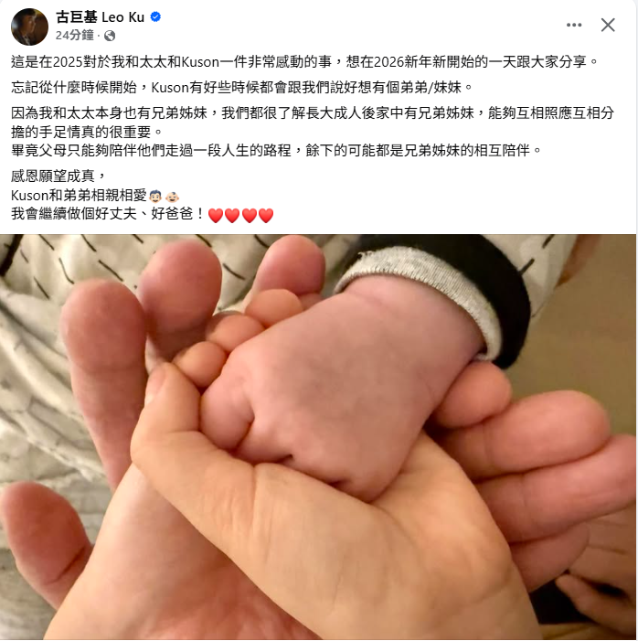 古巨基在IG上載一家三口的手部照,見到小手非常有肉,不像初生BB的手仔。他寫道︰「這是在2025對於我和太太和Kuson一件非常感動的事,想在2026新年新開始的一天跟大家分享。忘記從甚麼時候開始,Kuson有好些時候都會跟我們說好想有個弟弟/妹妹。因為我和太太本身也有兄弟姊妹,我們都很了解長大成人後家中有兄弟姊妹,能夠互相照應互相分擔的手足情真的很重要。畢竟父母只能夠陪伴他們走過一段人生的路程,餘下的可能都是兄弟姊妹的相互陪伴。感恩願望成真,Kuson和弟弟相親相愛我會繼續做個好丈夫、好爸爸!」圈中不少人送上祝福,經理人霍汶希留言說︰「人生完整了!」