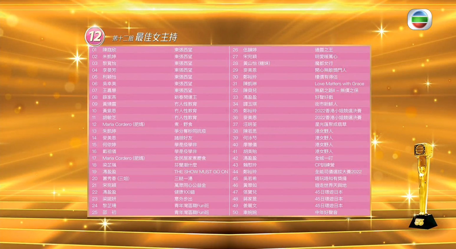 《萬千星輝頒獎典禮2022》將於明年1月8日舉行,無綫今日公布16個獎項提名名單,並向《萬金盛宴》、《全城一叮》及《香港小姐再競選》頒發由藝人投票的「我至Like《傳承·狂歡55》綜藝節目」。