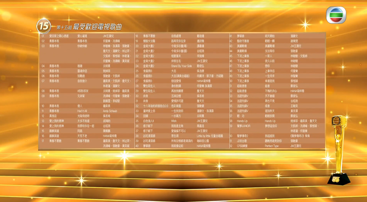 負責公布「最受歡迎電視男/女角色」的馬國明被問到看好哪位候選人時,他說女角色一定是湯洛雯,因為出於私心,並強撐《白色強人》所有藝人。譚俊彥公布「最佳男/女主角」名單,他今年只憑《十八年後的終極告白2.0》 角逐視帝,他直言今年平常心,並指林敏驄、陳山聰及陳展鵬都各有千秋。