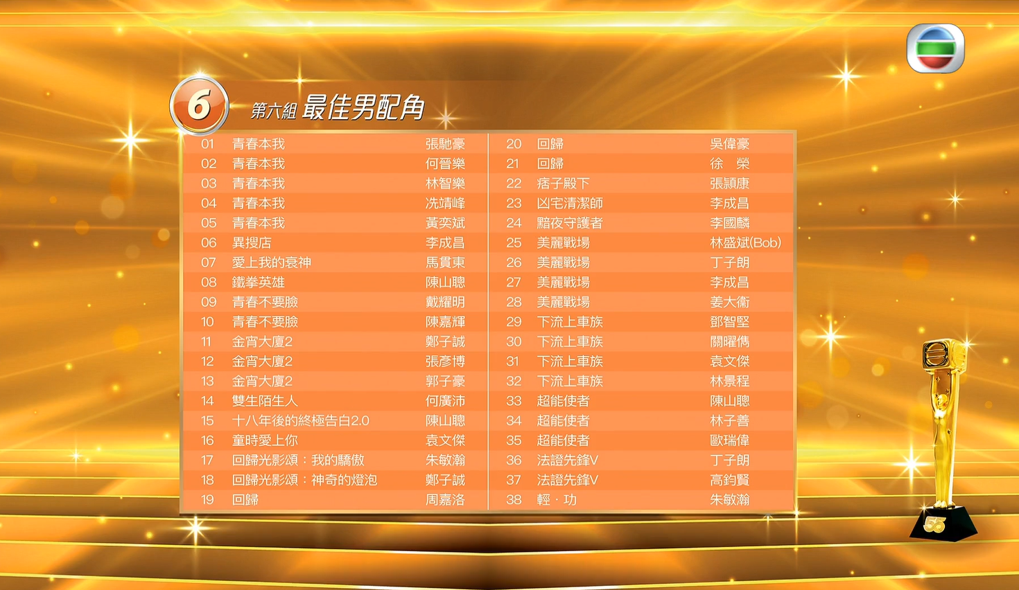 今年有6套劇集出街的陳山聰,分別入圍角逐視帝、男配角、最受歡迎電視拍檔及最受歡迎電視男角色4個獎項,共15個提名,成藝員之冠。今年視帝爭競相當激烈,大熱門林敏驄憑《下流上車族》入圍,陳山聰和何廣沛各有三劇入圍與林敏驄拗手瓜,而陳展鵬則分別憑《超能使者》、《黯夜守護者》、《回歸光影頌:母親的乒乓球》及《鐵拳英雄》角逐視帝寶座。