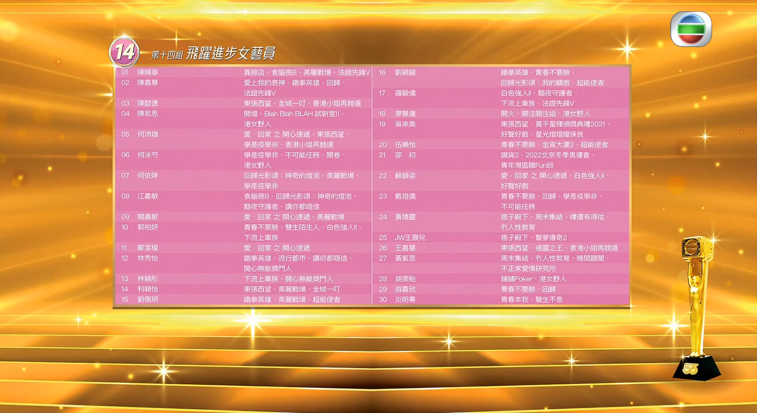 視后方面,已離巢的唐詩詠分別憑住《鐵拳英雄》、《回歸光影頌:我的驕傲》、《白色強人II》及《超能使者》入圍,但過去無綫愛頒給親生女,變相陳煒、江美儀、陳曉華及陳瀅獲睇高一線,其中陳曉華共有3劇入圍。