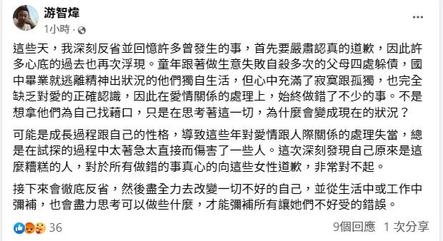 導演游智煒向受害人致歉,並把早前的涉me too的評論帖文刪除。