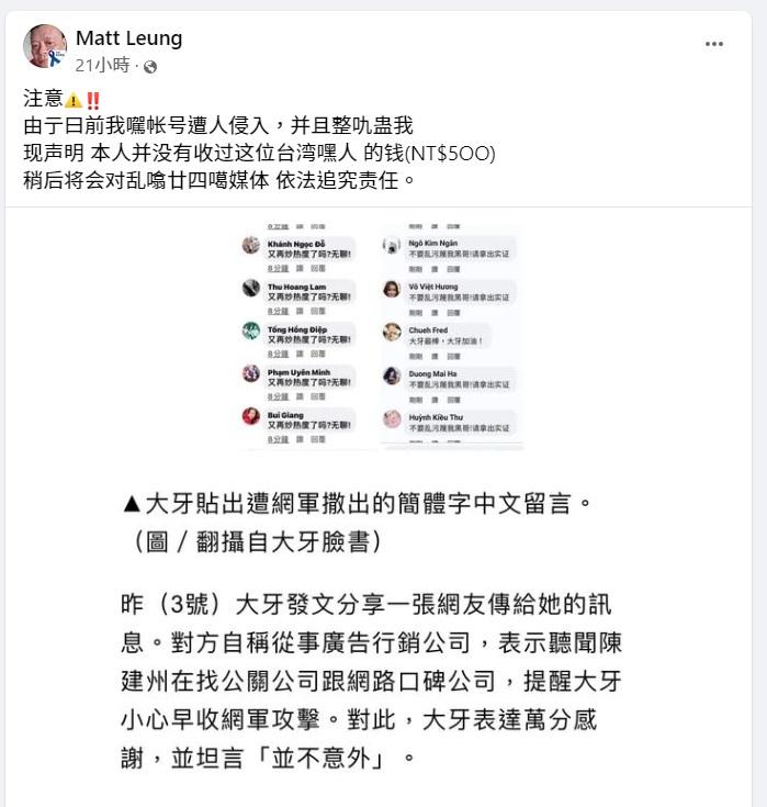 Matt Leung突然一夜之間成為台灣媒體報導對象,他隨即在其平台再以簡體字留言指自己的帳號被入侵,他從未收過黑人給予的500元新台幣,並會向有關媒體依法追究責任。之後他再轉載台灣另一媒體,並再度留言說︰「距呢個誹謗行為係相當之嚴重,現告知佢哋,若然表現合作,來港收取我噶津帥信並如實公訴自己的錯,刪除報道及發文道歉等,本人有機會減少追討的金額,希望他們珍惜機會。」令香港網民笑過不停,並稱他成功攻台。