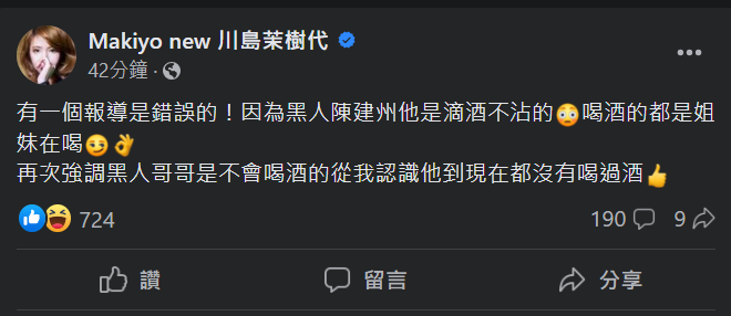 Makiyo於29日在Facebook發文表示,從認識陳建州到現在都沒見過他喝酒。(圖/翻攝自Facebook@Makiyo new 川島茉樹代)