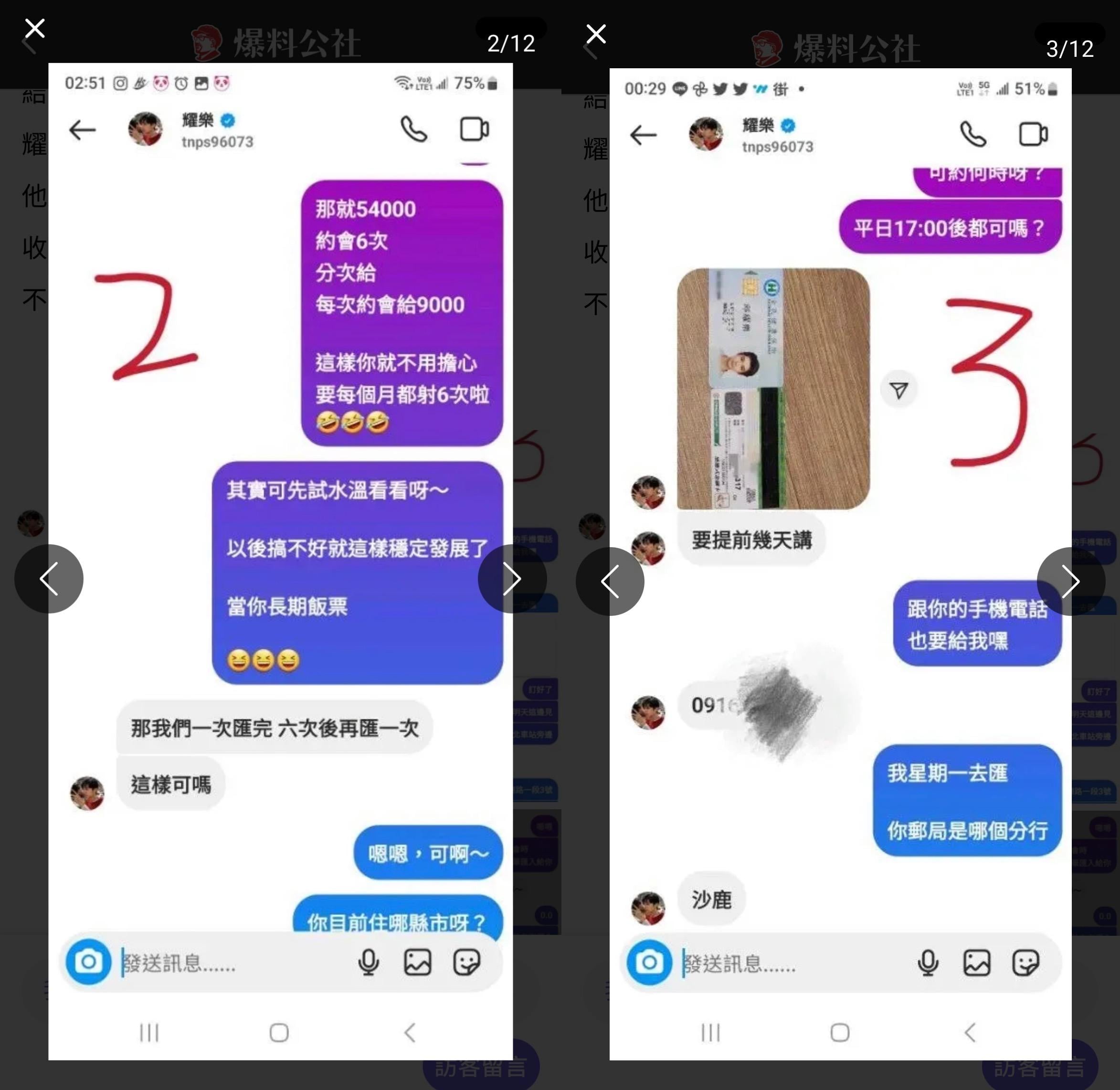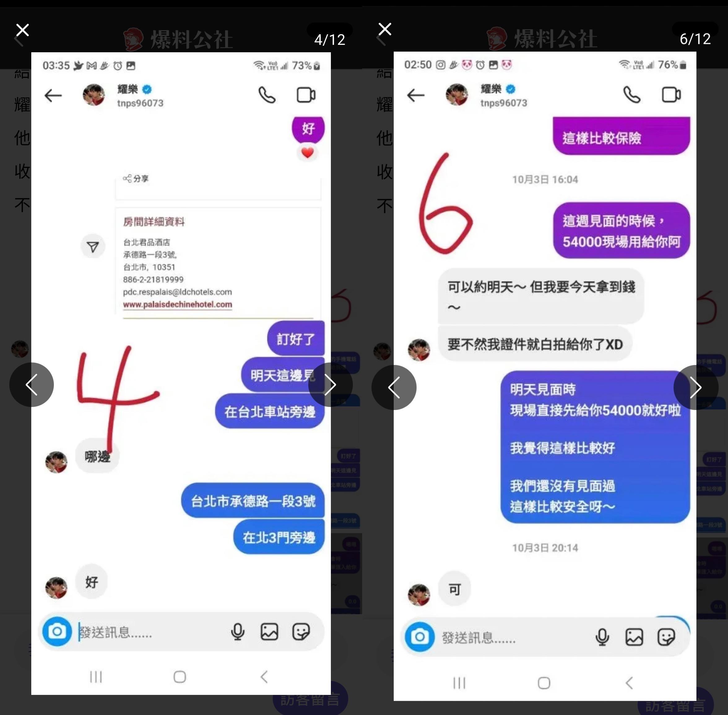 根據該網友發文以及對話內容截圖,耀樂曾和發文網民的友人約定「54000開房約會6次」,但在第一次開房時,耀樂就要求對方一次結清費用。