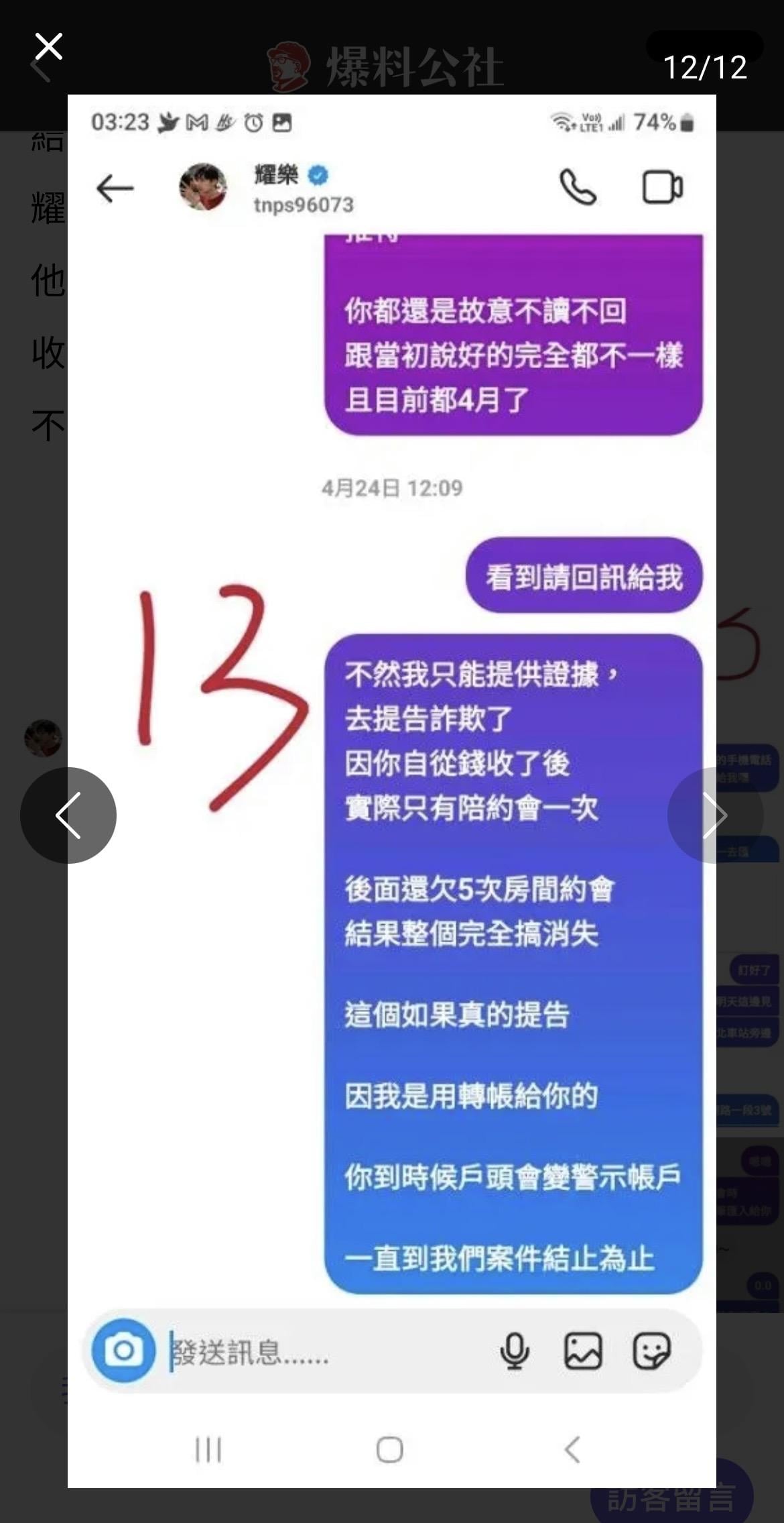 該友人照做之後,耀樂竟開始不回訊息,甚至神隱長達半年,爆料網友遂將當時友人與耀樂的13張對話截圖全曝光,在網上引起另一波熱議,不過耀樂21日僅在中午記者會現身說法,並未回應凌晨曝光的這篇爆料。