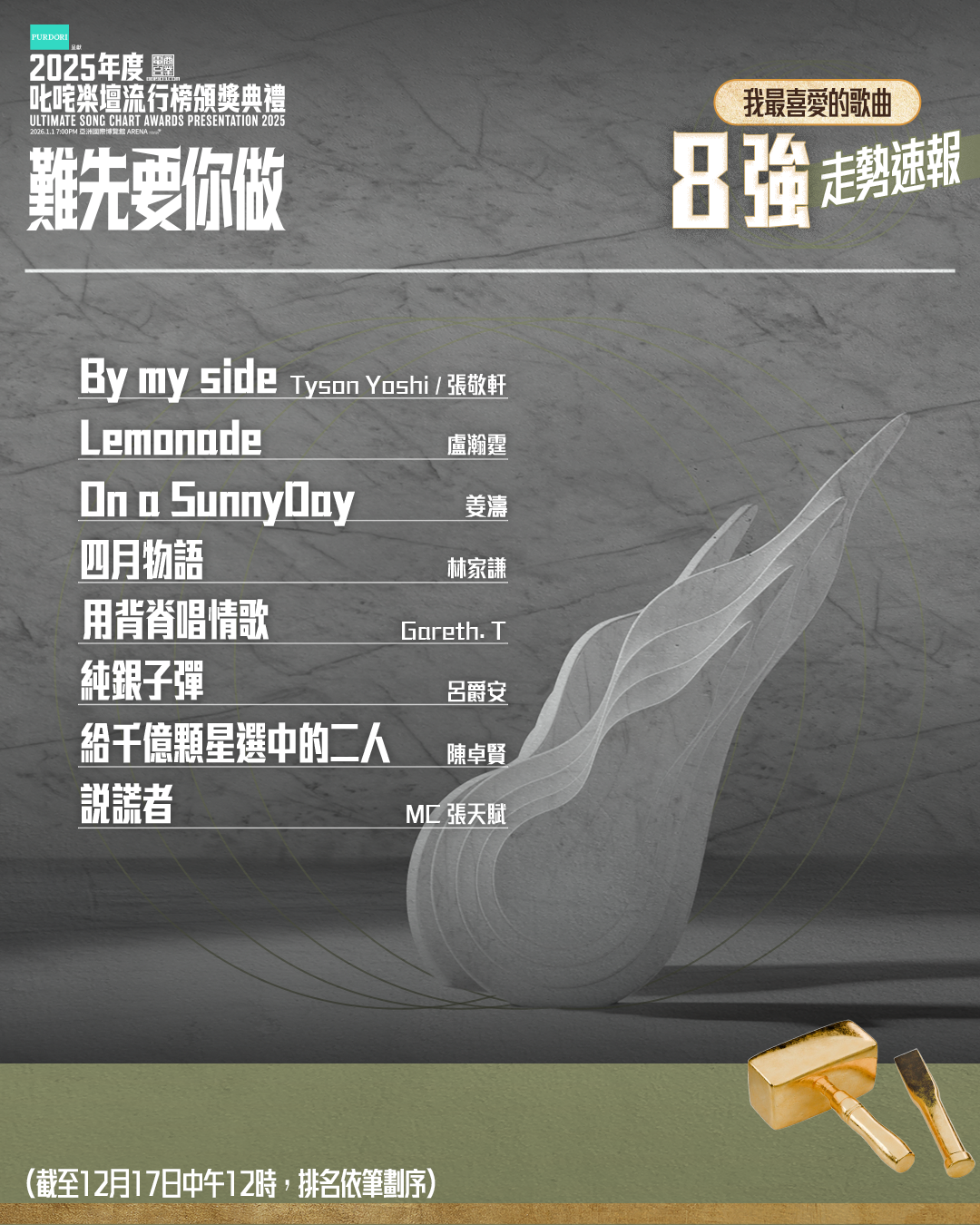 投票截至12月17日中午12時,今日得出8強走勢,分別是《By my side》Tyson Yoshi+張敬軒、《Lemonade》盧瀚霆、《On a Sunny Day》姜濤、《四月物語》林家謙 、《用背脊唱情歌》Gareth.T湯令山、《純銀子彈》呂爵安、《給千億顆星選中的二人》陳卓賢、《說謊者》MC張天賦,而日前打入10強的《今繼》柳應廷及《白夜行》Gin Lee李幸倪卻暫時落後。「叱咤樂壇我最喜愛的歌曲」第二階段投票將於本周五(12月19日)中午12時結束,屆時便會選出最後五強,並於2026年1月1日頒獎典禮當晚由現場觀眾即場投票選出最喜愛的歌曲!