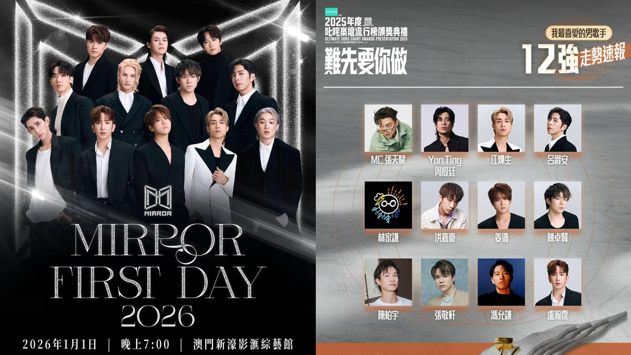 「叱咤樂壇我最喜愛的男歌手」十二強最新走勢︰MC 張天賦、Yan Ting 周殷廷、江𤒹生、呂爵安、林家謙、洪嘉豪、姜濤、 陳卓賢、陳柏宇、張敬軒、馮允謙、盧瀚霆。MIRROR較早前受訪預告因工作安排會缺席現身叱吒頒獎典禮,據現時投票走勢,MIRROR其中五位成員照殺入12強角逐「我最喜愛的男歌手」。