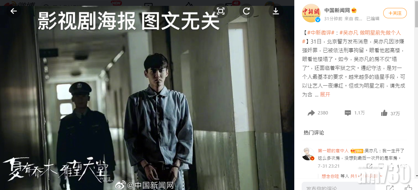 30歲大陸藝人吳亦凡早前捲入桃色風波,吳亦凡及其工作室先後發聲明否認,他更表明︰「如果有這類行為,請大家放心,我會自己進監獄!我對自己上述的所有話負法律責任。」事隔多時,北京公安今晚在微博發布最新消息,指吳亦凡涉嫌強姦罪,目前被刑事拘留。全文內容如下:「針對網絡舉報的『吳某凡多次誘騙年輕女性發生性關系』等有關情況,經警方調查,吳某凡(男,30歲,加拿大籍)因涉嫌強姦罪,目前已被朝陽公安分局依法刑事拘留,案件偵辦工作正在進一步開展。」