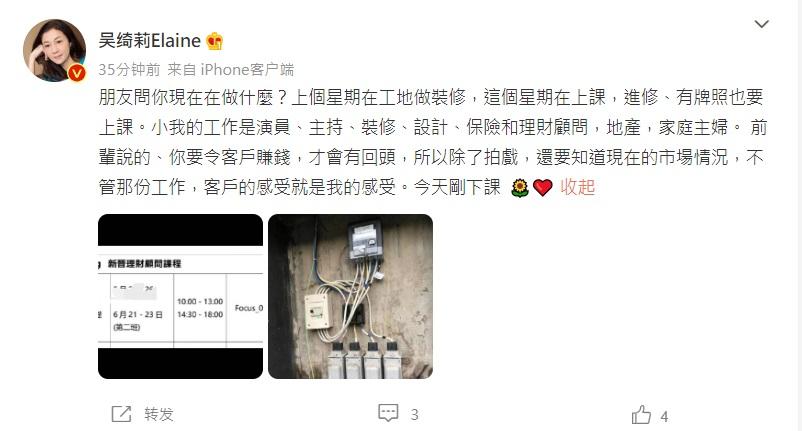 今日她再在微博透露自己的工作情況,並上載課程時間表及一張電標圖。她稱上星期到工地做裝修,而今個星期則去進修及上堂,更列出自己的工作範疇︰「我的工作是演員、主持、裝修、設計、保險和理財顧問,地產,家庭主婦。」