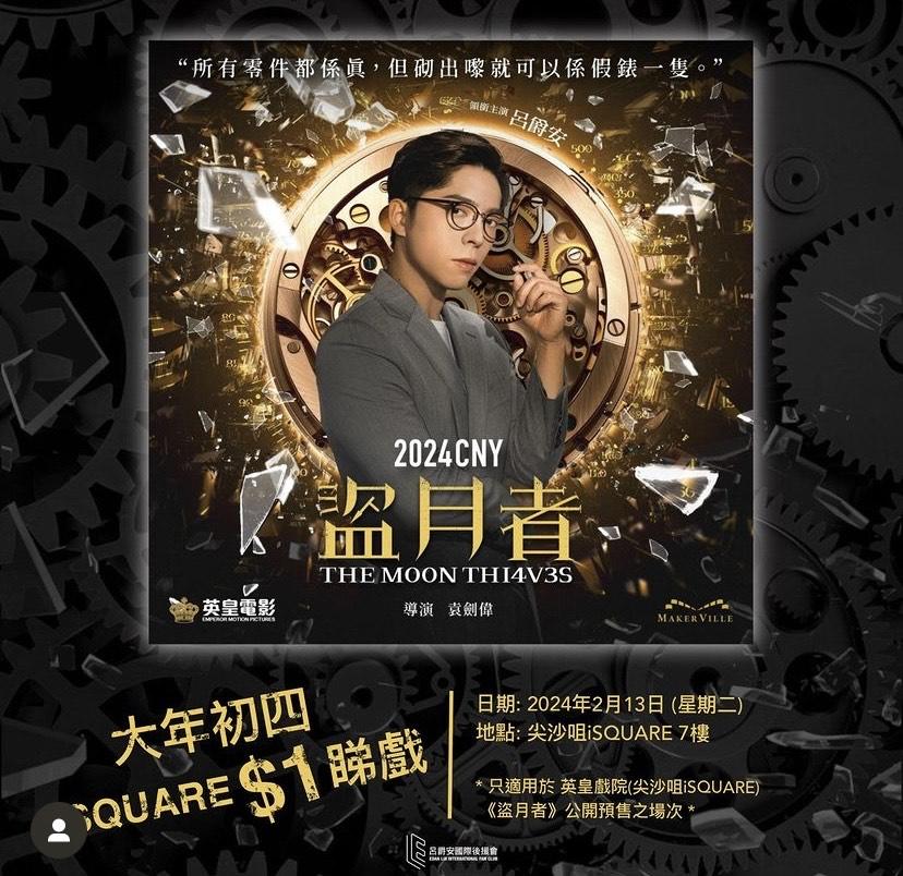由呂爵安(Edan) 、盧瀚霆、、張繼聰及白只主演,姜濤特別演出的賀歲電影《盜月者》明天(9日)上映。每次MIRROR有新搞作,鏡粉們都會落力籌備應援活動,而呂爵安國際後援會為宣傳電影,昨日便宣布將於下周二(13日/ 年初四)推出1元(原價為$110)購買戲票優惠。