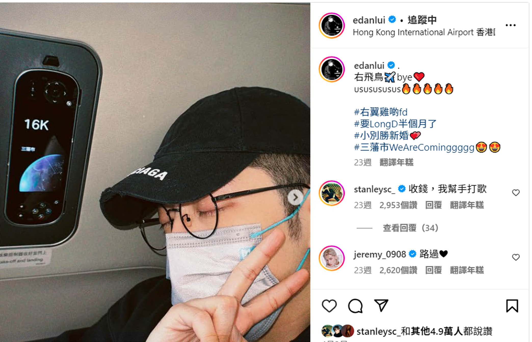 MIRROR成員呂爵安Edan日前公開承認追求林明禎,二人年齡相距7年,令不少人大感譁然。及後有人發現Edan在4月於IG發文透露自己前往美國,而他在hashtag打了「要LongD半個月了」、「小別勝新婚」的字眼,估計他是跟林明禎說,甚至有人認為二人已經一齊數個月。
