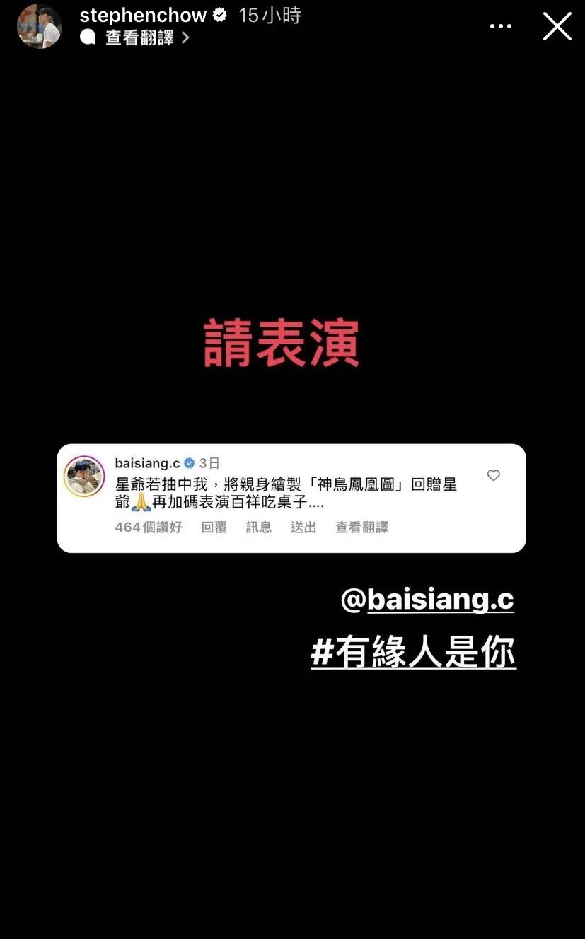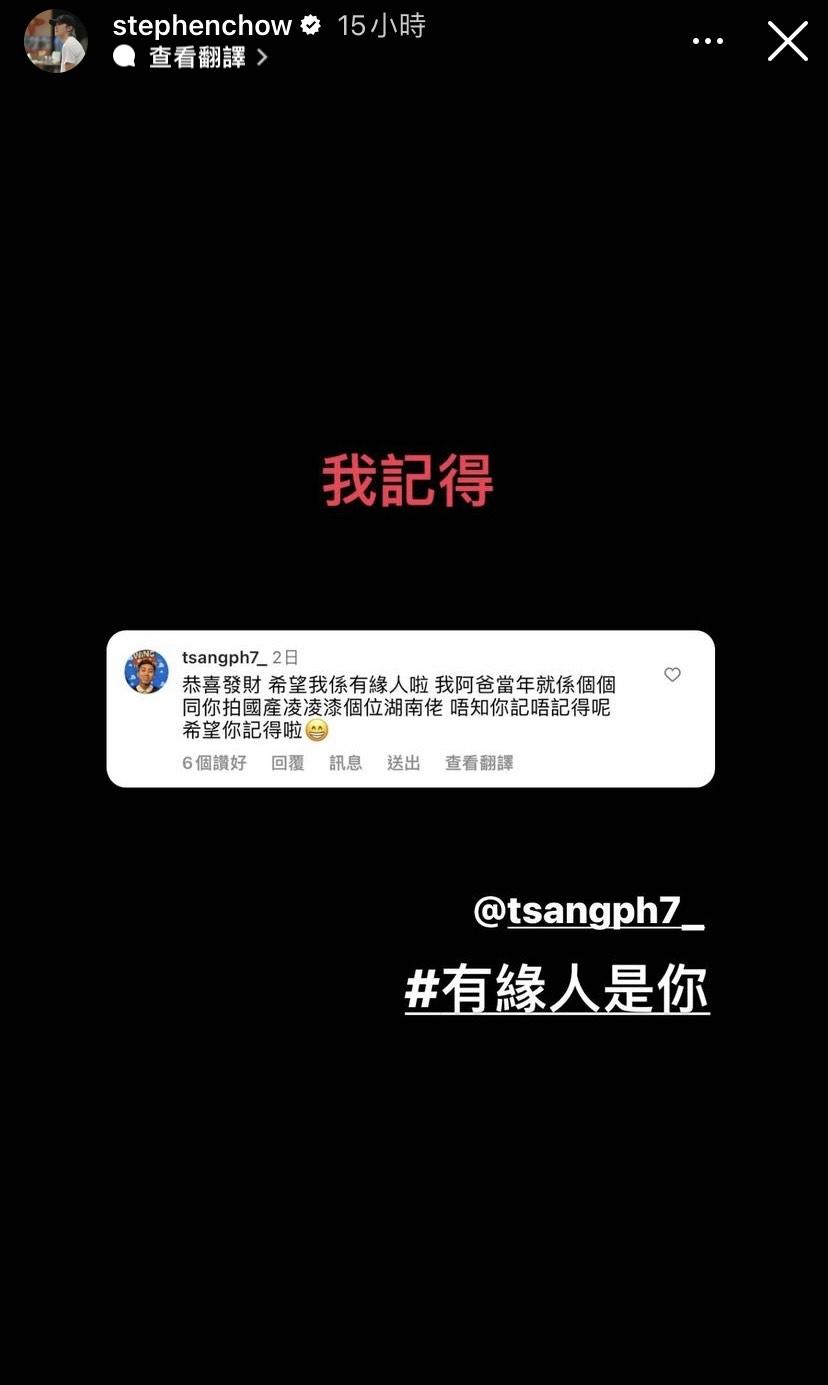 周星馳(星爺)去年10月開設IG帳戶,Followers已衝破67萬大關,而星爺亦一改低調作風,頻頻與粉絲互動,早前踏入2023年元旦節,更特別出PO讓大家許願,日前大年初二,他亦親自揮筆寫下「心想事成」揮春,並表示會送贈給20位有緣人,吸引不少圈中藝人及網民留言。昨晚(26日)星爺率先在社交網公布首七名幸運兒,當中除有陳冠希、王菀之、COLLAR成員Day、金馬影后賈靜雯、《木躍4超玩》的製作人百祥,還有在《國產凌凌漆》飾演湖南佬,已故演員曾守明的兒子。